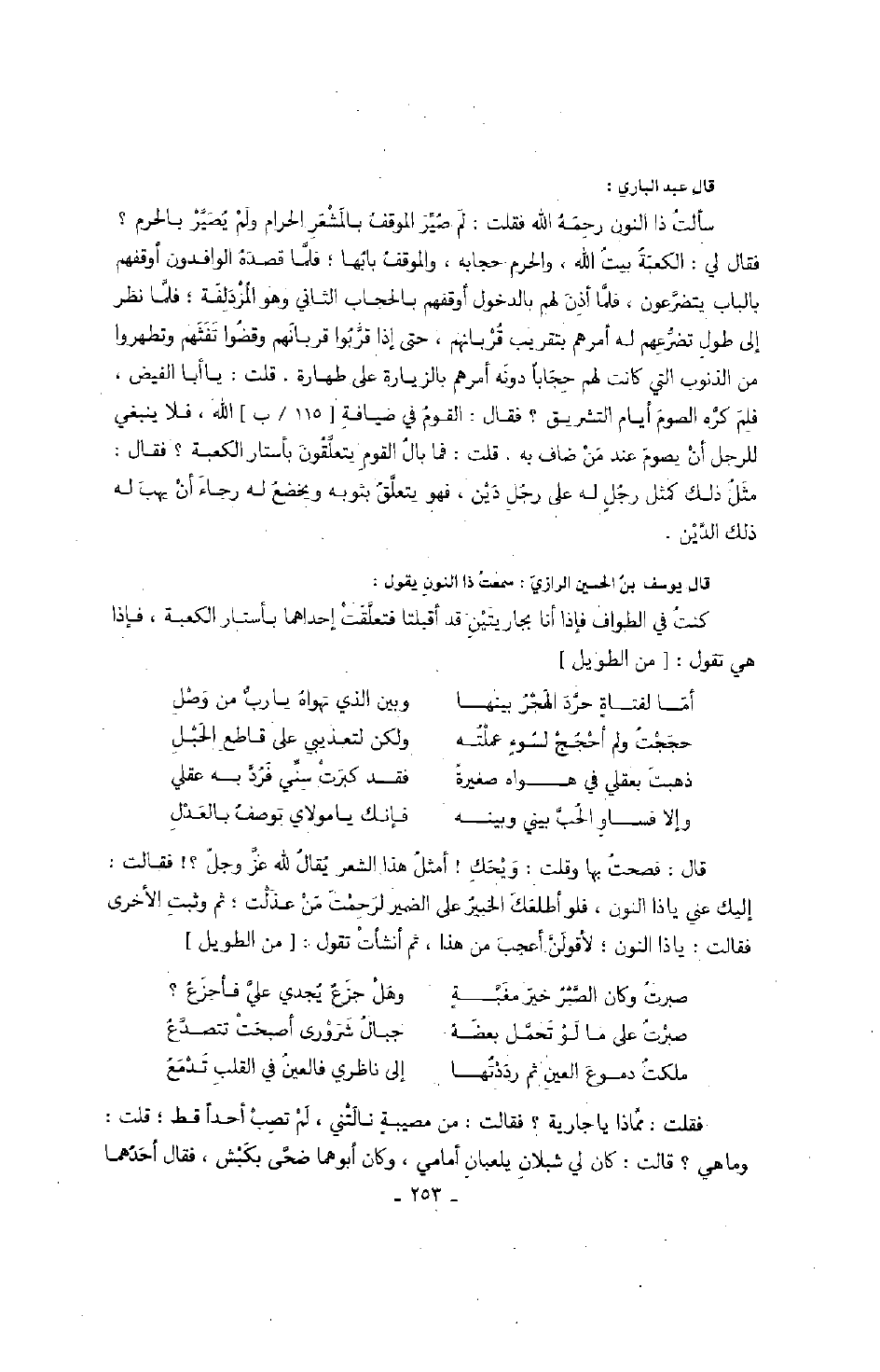 قال يوسف بن الحسين الرازي: سمعت ذا النون يقول: كنت في الطواف فإذا أنا بجاريتين قد أقبلتا فتعلقت إحداهما بأستار الكعبة، فإذا هي تقول: