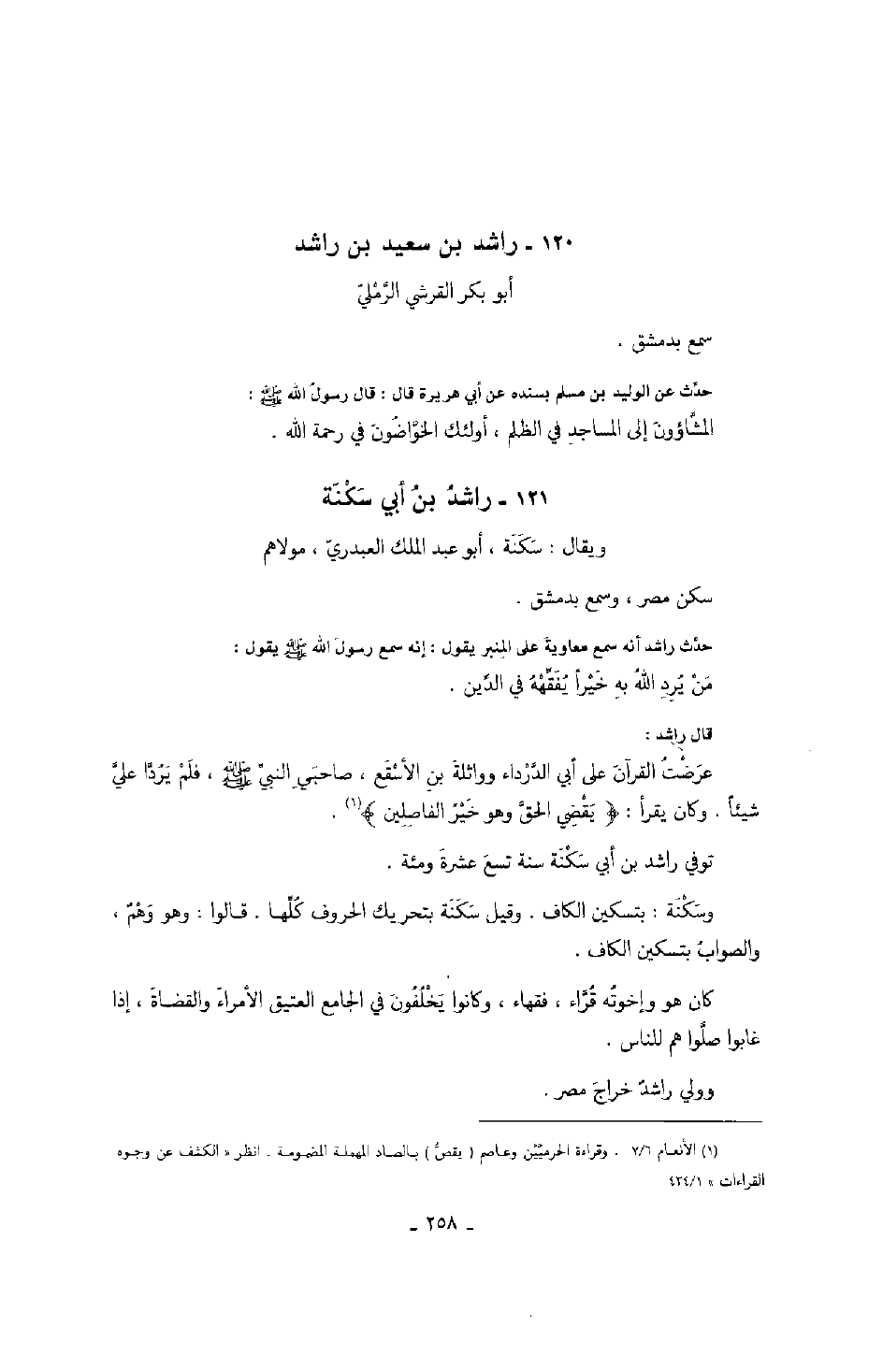 قال راشد: عرضت القرآن على أبي الدرداء وواثلة بن الأسقع، صاحبي النبي صَلَّى اللهُ عَلَيْهِ وَسَلَّمَ، فلم يردا علي شيئاً. وكان يقرأ: " يقضي الحق وهو خير الفاصلين ".