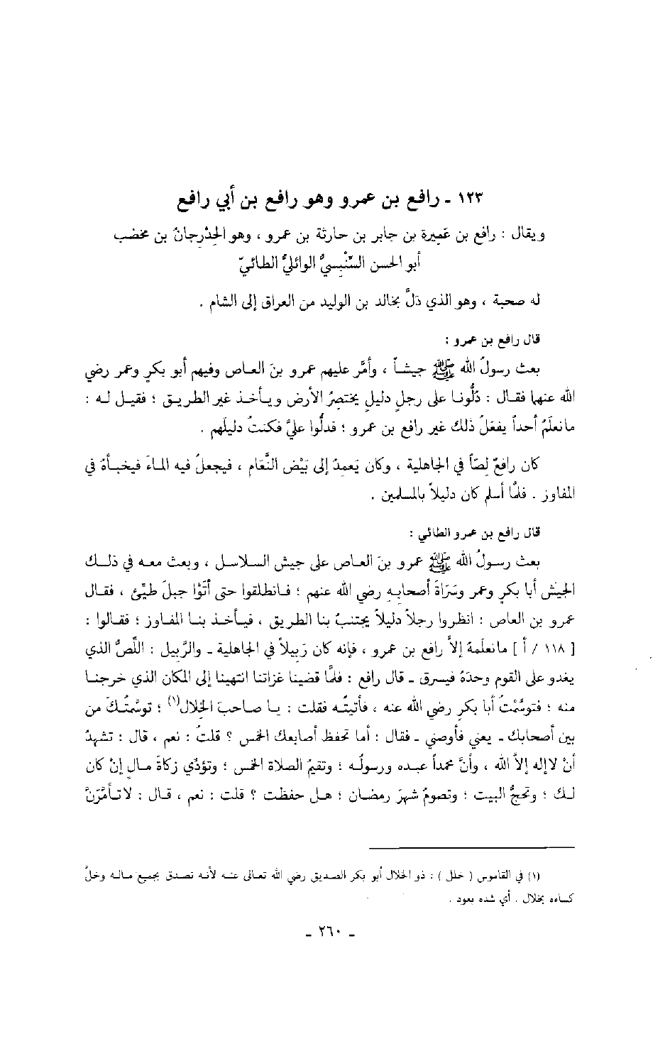 قال رافع بن عمرو الطائي: بعث رسول الله صَلَّى اللهُ عَلَيْهِ وَسَلَّمَ عمرو بن العاص على جيش السلاسل، وبعث معه في ذلك الجيش أبا بكر وعمر وسراة أصحابه رضي الله عنهم؛ فانطلقوا حتى أتوا جبل طيئ، فقال عمرو بن العاص: انظروا رجلاً دليلاً يجتنب بنا الطريق، فيأخذ بنا المفاوز؛ فقالوا: ما نعلمه إلا رافع بن عمرو، فإنه كان ربيلاً في الجاهلية والربيل: اللص الذي يغدو على القوم وحده فيسرق قال رافع: فلما قضينا غزاتنا انتهينا إلى المكان الذي خرجنا منه؛ فتوسمت أبا بكر رضي الله عنه، فأتيته فقلت: يا صاحب الخلال؛ توسمتك من بين أصحابك يعني فأوصني فقال: أما تحفظ أصابعك الخمس؟ قلت: نعم، قال: تشهد أن لا إله إلا الله، وأن محمداً عبده ورسوله؛ وتقيم الصلاة الخمس؛ وتؤدي زكاة مال إن كان لك؛ وتحج البيت؛ وتصوم شهر رمضان؛ هل حفظت؟ قلت: نعم، قال: لا تأمرن