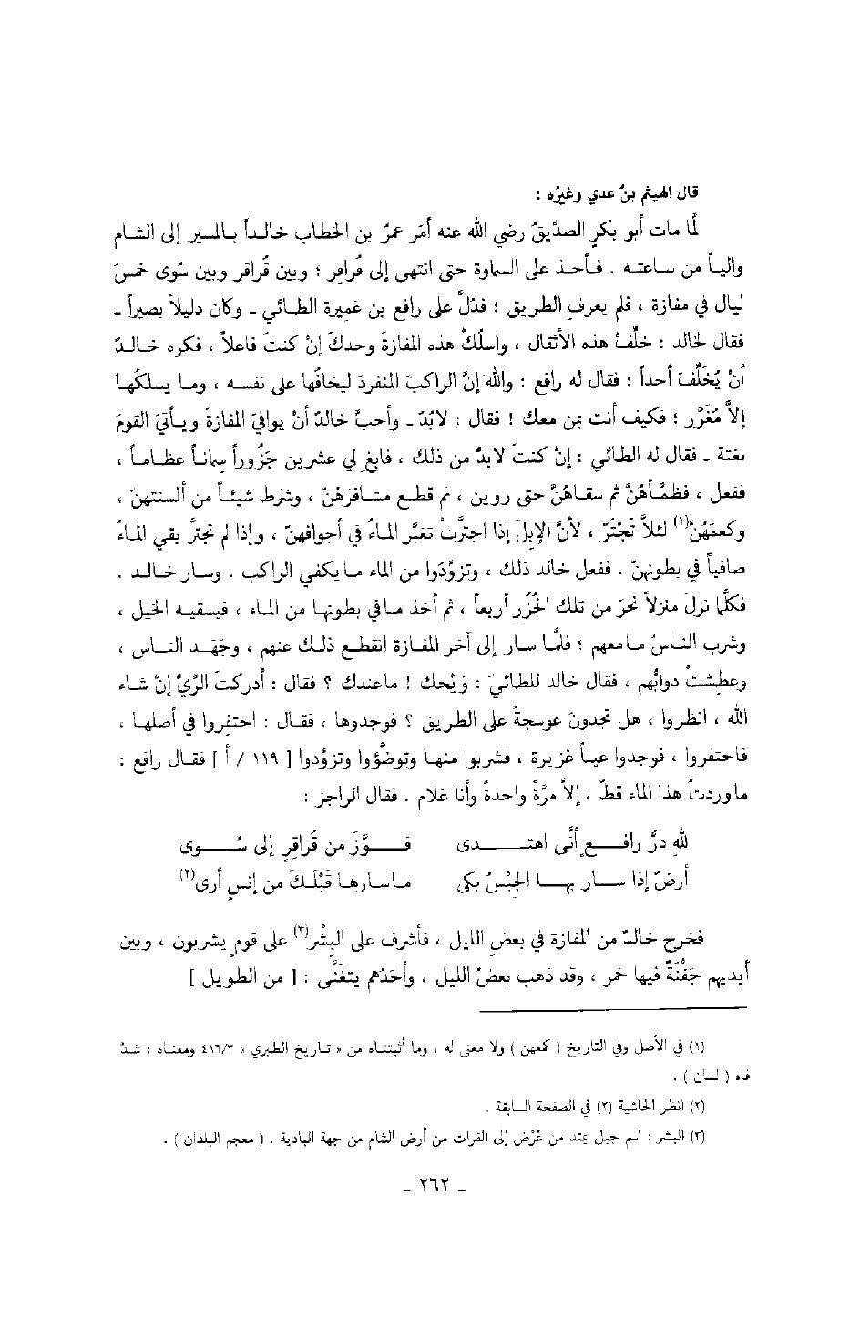 قال الهيثم بن عدي وغيره: لما مات أبو بكر الصديق رضي الله عنه أمر عمر بن الخطاب خالداً بالمسير إلى الشام والياً من ساعته. فأخذ على السماوة حتى انتهى إلى قراقر؛ وبين قراقر وبين سوى خمس ليال في مفازة، فلم يعرف الطريق؛ فدل على رافع بن عميرة الطائي وكان دليلاً بصيراً فقال لخالد: خلف هذه الأثقال، واسلك هذه المفازة وحدك إن كنت فاعلاً، فكره خالد أن يخلف أحداً؛ فقال له رافع: والله إن الراكب المنفرد ليخافها على نفسه، وما يسلكها إلا مغرر؛ فكيف أنت بمن معك! فقال: لا بد وأحب خالد أن يوافي المفازة ويأتي القوم بغتة فقال له الطائي: إن كنت لا بد من ذلك، فابغ لي عشرين جزوراً سماناً عظاماً، ففعل، فظمأهن ثم سقاهن حتى روين، ثم قطع مشافرهن، وشرط شيئاً من ألسنتهن، وكعمهن لئلا تجتر، لأن الإبل إذا اجترت تغير الماء في أجوافهن، وإذا لم تجتر بقي الماء صافياً في بطونهن. ففعل خالد ذلك، وتزودوا من الماء ما يكفي الراكب. وسار خالد. فكلما نزل منزلاً نحر من تلك الجزر أربعاً، ثم أخذ ما في بطونها من الماء، فيسقيه الخيل، وشرب الناس ما معهم؛ فلما سار إلى آخر المفازة انقطع ذلك عنهم، وجهد الناس، وعطشت دوابهم، فقال خالد الطائي: ويحك! ما عندك؟ فقال: أدركت الري إن شاء الله، انظروا، هل تجدون عوسجةً على الطريق؟ فوجدوها، فقال: احتفروا في أصلها، فاحتفروا، فوجدوا عيناً غزيرة، فشربوا منها وتوضؤوا وتزودوا فقال رافع: ما وردت هذا الماء قط، إلا مرةً واحدةً وأنا غلام. فقال الزاجر: