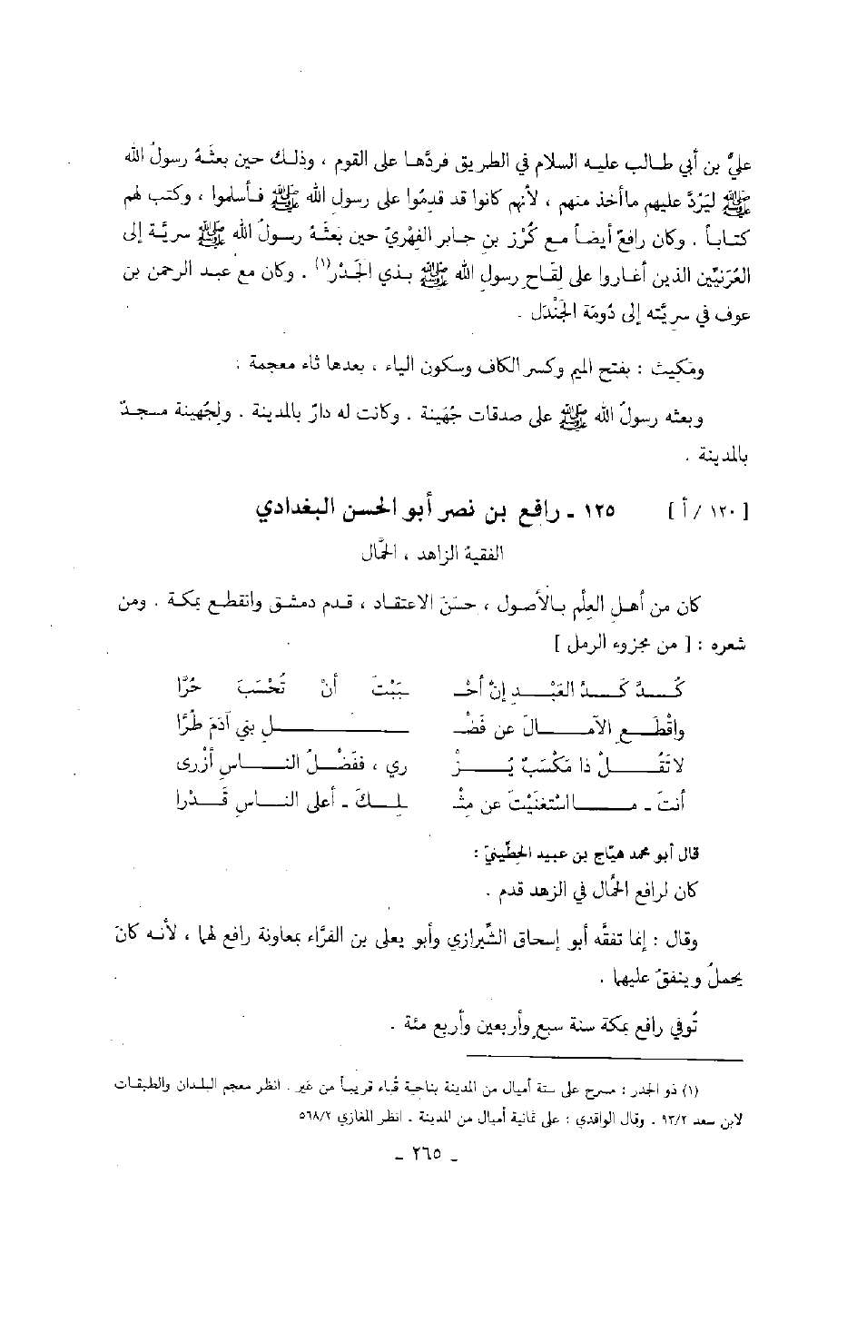 علي بن أبي طالب عليه السلام في الطريق فردها على القوم، وذلك حين بعثه رسول الله صَلَّى اللهُ عَلَيْهِ وَسَلَّمَ ليرد عليهم ما أخذ منهم، لأنهم كانوا قد قدموا على رسول الله صَلَّى اللهُ عَلَيْهِ وَسَلَّمَ فأسلموا، وكتب لهم كتاباً. وكان رافع أيضاً مع كرز بن جابر الفهري حين بعثه رسول الله صَلَّى اللهُ عَلَيْهِ وَسَلَّمَ سرية إلى العرنيين الذين أغاروا على لقاح رسول الله صَلَّى اللهُ عَلَيْهِ وَسَلَّمَ بذي الجدر. وكان مع عبد الرحمن بن عوف في سريته إلى دومة الجندل. ومكيث: بفتح الميم وكسر الكاف وسكون الياء، بعدها ثاء معجمة. وبعثه رسول الله صَلَّى اللهُ عَلَيْهِ وَسَلَّمَ على صدقات جهينة. وكانت له دار بالمدينة. ولجهينة مسجد بالمدينة.