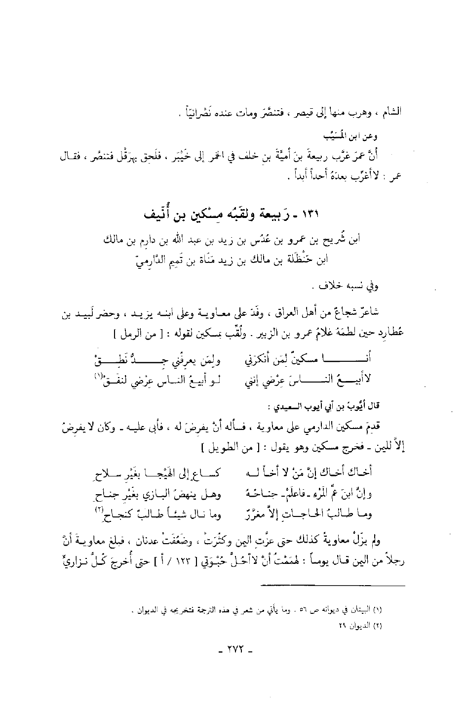 قال أيوب بن أبي أيوب السعيدي: قدم مسكين الدارمي على معاوية، فسأله أن يفرض له، فأبى عليه وكان لا يفرض إلا لليمن فخرج مسكين وهو يقول: