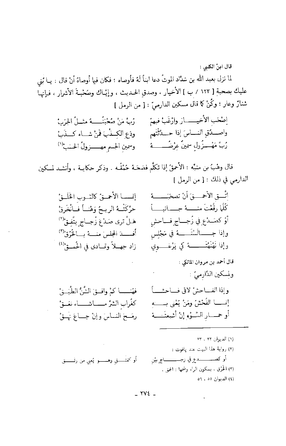 قال ابن الكلبي: لما نزل بعبد الله بن شداد الموت دعا ابناً له فأوصاه؛ فكان فيما أوصاه أن قال: يا بني عليك بصحبة الأخيار، وصدق الحديث، وإياك وصحبة الأشرار، فإنها شنار وعار؛ وكن كما قال مسكين الدارمي: