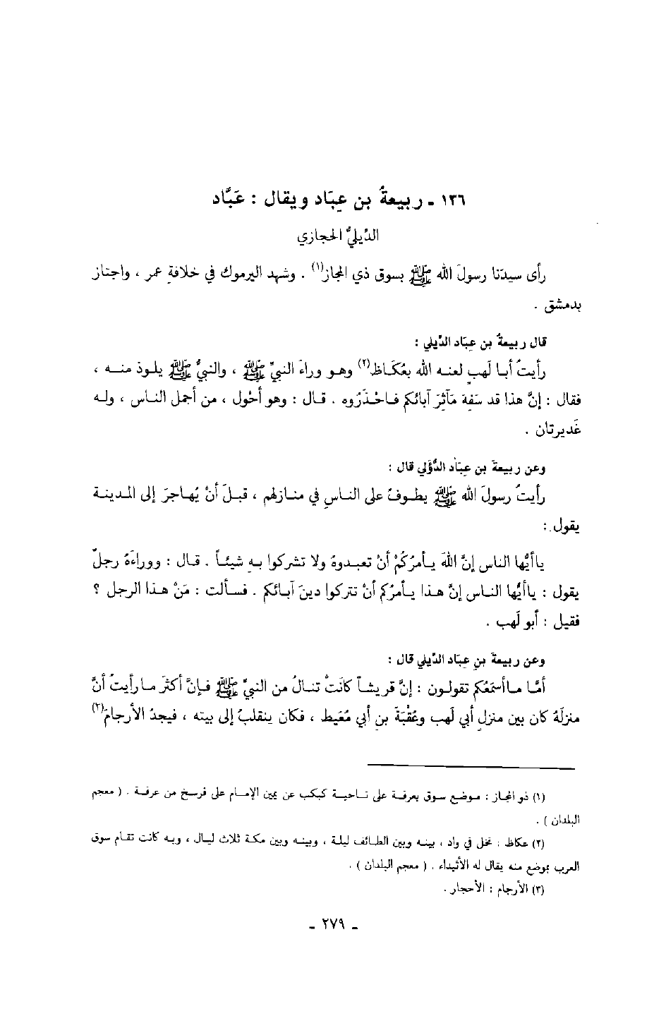 وعن ربيعة بن عباد الدؤلي قال: رأيت رسول الله صَلَّى اللهُ عَلَيْهِ وَسَلَّمَ يطوف على الناس في منازلهم، قبل أن يهاجر إلى المدينة يقول: يا أيها الناس إن الله يأمركم أن تعبدوه ولا تشركوا به شيئاً. قال: ووراءه رجل يقول: يا أيها الناس إن هذا يأمركم أن تتركوا دين آبائكم. فسألت: من هذا الرجل؟ فقيل: أبو لهب.