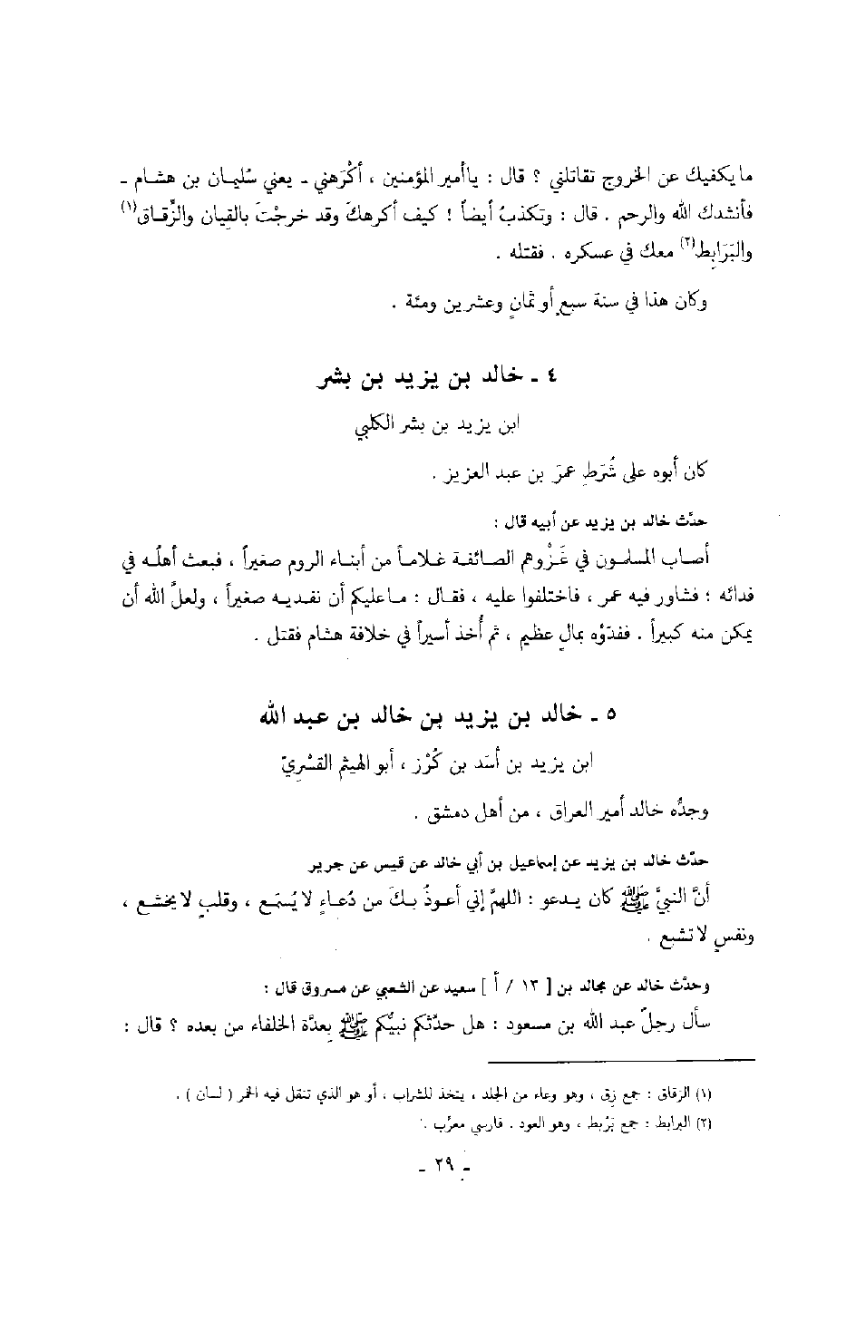 ما يكفيك عن الخروج تقاتلني؟ قال: يا أمير المؤمنين، أكرهني يعني سليمان بن هشام فأنشدك الله والرحم - قال: وتكذب أيضاً! كيف أكرهك وقد خرجت بالقيان والزقاق والبرابط معك في عسكره. فقتله. وكان هذا في سنة سبع أو ثمان وعشرين ومئة