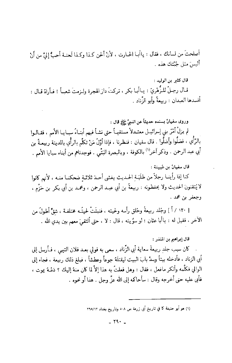 وروى سفيان بسنده حديثاً عن النبي صَلَّى اللهُ عَلَيْهِ وَسَلَّمَ قال: " لم يزل أمر بني إسرائيل معتدلاً مستقيماً حتى نشأ فيهم أبناء سبايا الأمم، فقالوا بالرأي، فضلوا وأضلوا. قال سفيان: فنظرنا، فإذا أول من تكلم بالرأي بالمدينة ربيعة بن أبي عبد الرحمن. وذكر آخر بالكوفة، وبالبصرة البتي. فوجدناهم من أبناء سبايا الأمم.