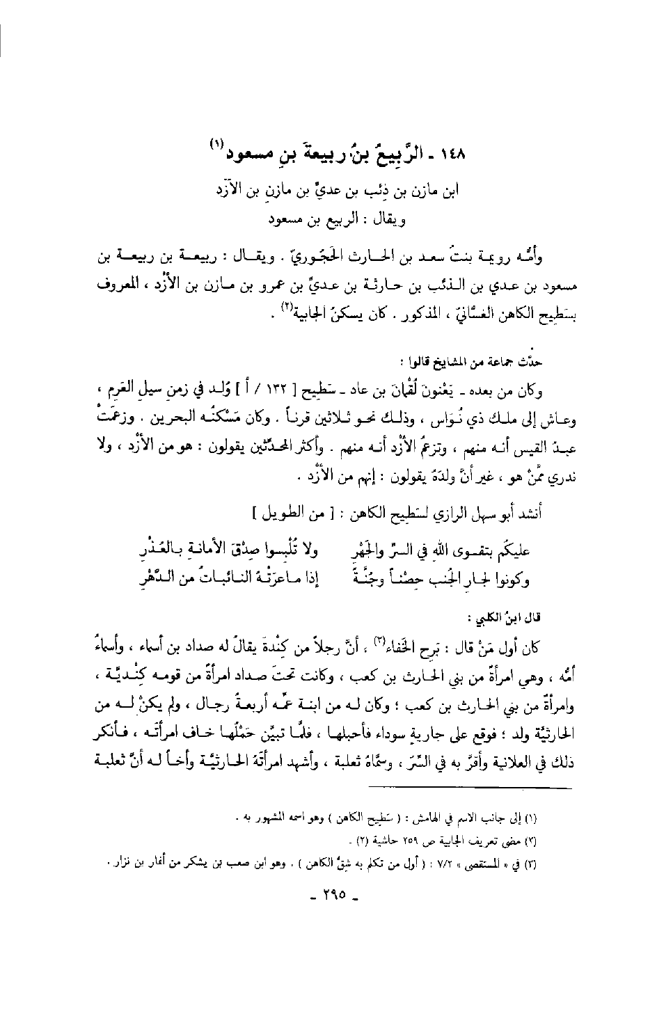 حدث جماعة من المشايخ قالوا: وكان من بعده يعنون لقمان بن عاد سطيح ولد في زمن سيل العرم، وعاش إلى ملك ذي نواس، وذلك نحوا ثلاثين قرناً. وكان مسكنه البحرين. وزعمت عبد القيس أنه منهم، وتزعم الأزد أنه منهم. وأكثر المحدثين يقولون: هو من الأزد، ولا ندري ممن هو، غير أن ولده يقولون: إنهم من الأزد.