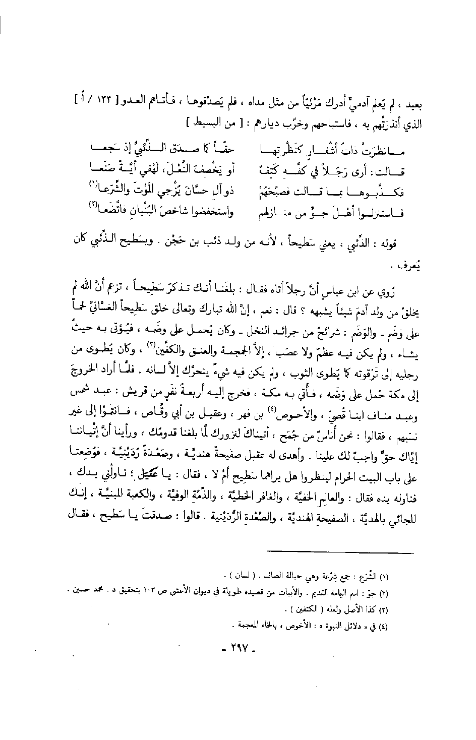روي عن ابن عباس أن رجلاً أتاه فقال: بلغنا أنك تذكر سطيحاً، تزعم أن الله لم يخلق من ولد آدم شيئاً يشبهه؟ قال: نعم، إن الله تبارك وتعالى خلق سطيحاً الغساني لحماً على وضم والوضم: شرائح من جرائد النخل وكان يحمل على وضمه، فيؤتى به حيث يشاء، ولم يكن فيه عظم ولا عصب، إلا الجمجمة والعنق والكفين، وكان يطوى من رجليه إلى ترقوته كما يطوى الثوب، ولم يكن فيه شيء يتحرك إلا لسانه. فلما أراد الخروج إلى مكة حمل على وضمه، فأتي به مكة، فخرج إليه أربعة نفر من قريش: عبد شمس وعبد مناف ابنا قصي، والأحوص بن فهر، وعقيل بن أبي وقاص، فانتموا إلى غير نسبهم، فقالوا: نحن أناس من جمح، أتيناك لنزورك لما بلغنا قدومك، ورأينا أن إتياننا إياك حق واجب لك علينا. وأهدى له عقيل صفيحةً هنديةً، وصعدةً ردينيةً، فوضعتا على باب البيت الحرام لينظروا هل يراهما سطيح أم لا؟، فقال: يا عقيل؛ ناولني يدك، فناوله يده فقال: والعالم الخفية، والغافر الخطية، والذمة الوفية، والكعبة المبنية، إنك للجائي بالهدية، الصفيحة الهندية، والصعيدة الردينية. قالوا: صدقت يا سطيح، فقال: