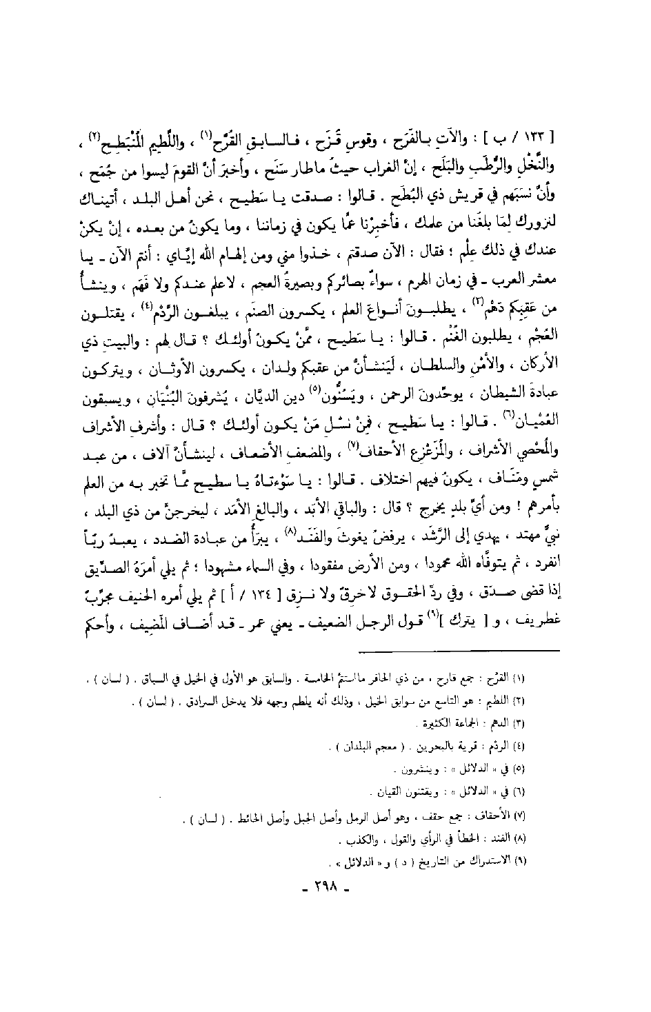 والآت بالفرح، وقوس قزح، فالسابق القرح، واللطيم المنبطح، والنخل والرطب والبلح، إن الغراب حيث ما طار سنح، وأخبر أن القوم ليسوا من جمح، وأن نسبهم في قريش ذي البطح. قالوا: صدقت يا سطيح، نحن أهل البلد، أتيناك لنزورك لما بلغنا من علمك، فأخبرنا عما يكون في زماننا، وما يكون من بعده، إن يكن عندك في ذلك علم؛ فقال: الآن صدقتم، خذوا مني ومن إلهام الله إياي: أنتم الآن يا معشر العرب في زمان الهرم، سواء بصائركم وبصيرة العجم، لا علم عندكم ولا فهم، وينشأ من عقبكم دهم، يطلبون أنواع العلم، يكسرون الصنم، يبلغون الردم، يقتلون العجم، يطلبون الغنم. قالوا: يا سطيح، ممن يكون أولئك؟ قال لهم: والبيت ذي الأركان، والأمن والسلطان، لينشأن من عقبكم ولدان، يكسرون الأوثان، ويتركون عبادة الشيطان، يوحدون الرحمن، ويسنون دين الديان، يشرفون البنيان، ويسبقون العميان. قالوا: يا سطيح، فمن نسل من يكون أولئك؟ قال: وأشرف الأشراف والمحصي الأشراف، والمزعزع الأحقاف، والمضعف الأضعاف، لينشأن آلاف، من عبد شمس ومناف، يكون فيهم اختلاف. قالوا: يا سوءتاه يا سطيح مما تخبر به من العلم بأمرهم! ومن أي بلد يخرج؟ قال: والباقي الأبد، والبالغ الأمد، ليخرجن من ذي البلد، نبي مهتد، يهدي إلى الرشد، يرفض يغوث والفند، يبرأ من عبادة الضدد، يعبد رباً انفرد، ثم يتوفاه الله محمودا، ومن الأرض مفقودا، وفي السماء مشهودا؛ ثم يلي أمره الصديق إذا قضى صدق، وفي رد الحقوق لا خرق ولا نزق ثم يلي أمره الحنيف مجرب غطريف، ويترك قول الرجل الضعيف يعني عمر قد أضاف المضيف، وأحكم