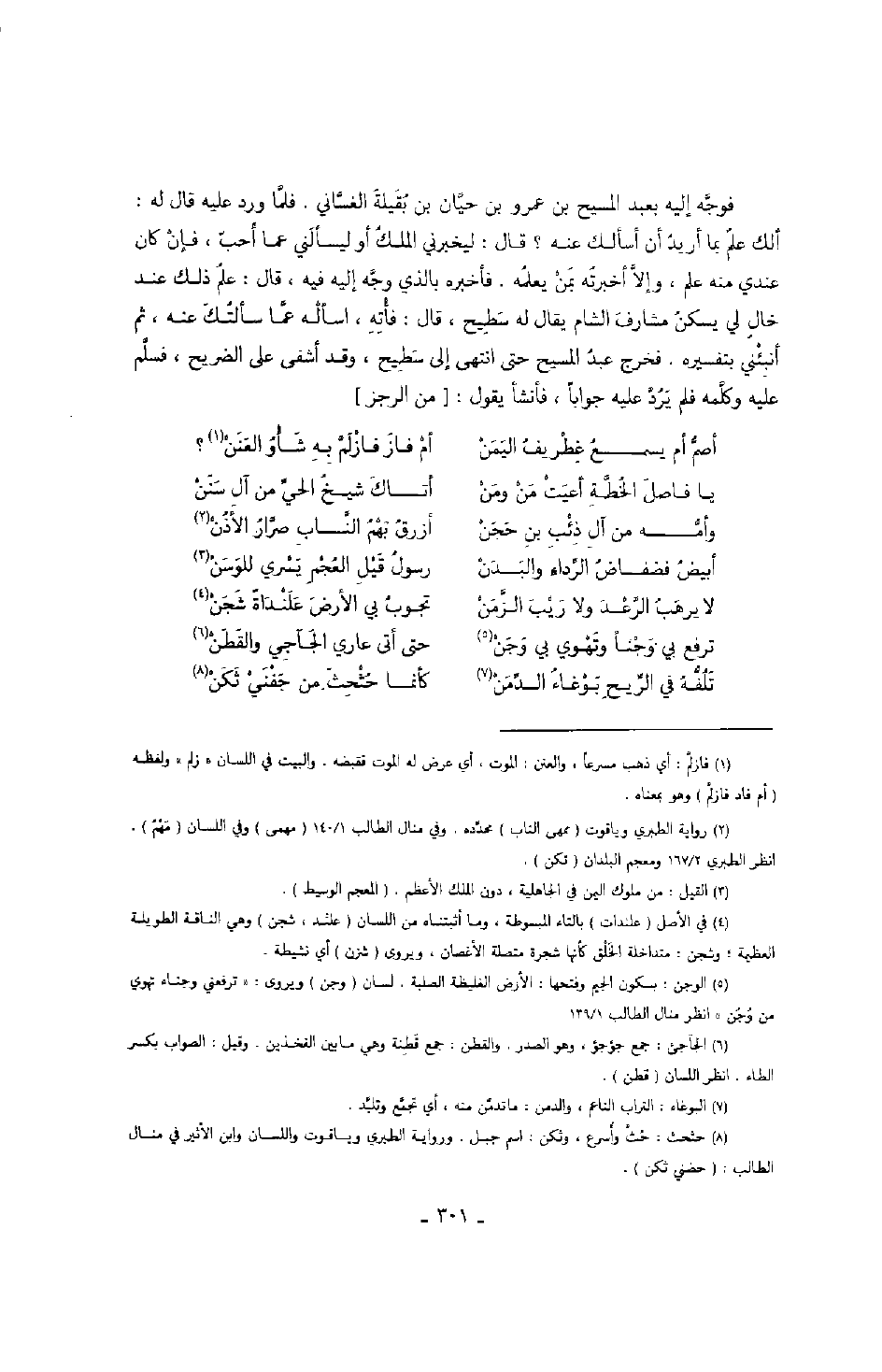 فوجه إليه بعبد المسيح بن عمرو بن حيان بن بقيلة الغساني. فلما ورد عليه قال له: ألك علم بما أريد أن أسألك عنه؟ قال: ليخبرني الملك أو ليسألني عما أحب، فإن كان عندي منه علم، وإلا أخبرته بمن يعلمه. فأخبره بالذي وجه إليه فيه، قال: علم ذلك عند خال لي يسكن مشارف الشام يقال له سطيح، قال: فأته، اسأله عما سألتك عنه، ثم أنبئني بتفسيره. فخرج عبد المسيح حتى انتهى إلى سطيح، وقد أشفى على الضريح، فسلم عليه وكلمه فلم يرد عليه جواباً، فأنشأ يقول: