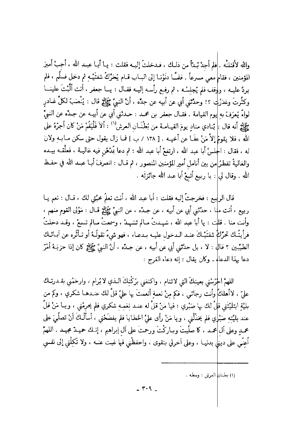 قال الربيع: فخرجت إليه فقلت: أبا عبد الله، أنت تعلم محبتي لك، قال: نعم يا ربيع، أنت منا، حدثني أبي عن أبيه، عن جده، عن النبي صَلَّى اللهُ عَلَيْهِ وَسَلَّمَ قال: مولى القوم منهم، وأنت منا. قلت: يا أبا عبد الله، شهدت ما لم تشهد، وسمعت ما لم تسمع، وقد دخلت فرأيتك تحرك شفتيك عند الدخول عليه بدعاء، فهو شيء تقوله أو تأثره عن آبائك الطيبين؟ قال: لا، بل حدثني أبي عن أبيه، عن جده، أن النبي صَلَّى اللهُ عَلَيْهِ وَسَلَّمَ كان إذا حزبه أمر دعا بهذا الدعاء وكان يقال: إنه دعاء الفرج: " اللهم احرسني بعينك التي لا تنام، واكنفني بركنك الذي لا يرام، وارحمني بقدرتك علي، لا أهلك وأنت رجائي، فكم من نعمة أنعمت بها علي قل لك عندها شكري، وكم من بلية ابتليتني قل لك بها صبري؛ فيا من قل له عند نعمه شكري فلم يحرمني، ويا من قل عند بليته صبري فلم يخذلني، ويا من رأى علي الخطايا فلم يفضحني، أسألك أن تصلي على محمد وعلى آل محمد، كما صليت وباركت ورحمت على آل إبراهيم، إنك حميد مجيد. اللهم أعني على ديني بدنيا، وعلى آخرتي بتقوى، واحفظني فيما غبت عنه، ولا تكلني إلى نفسي