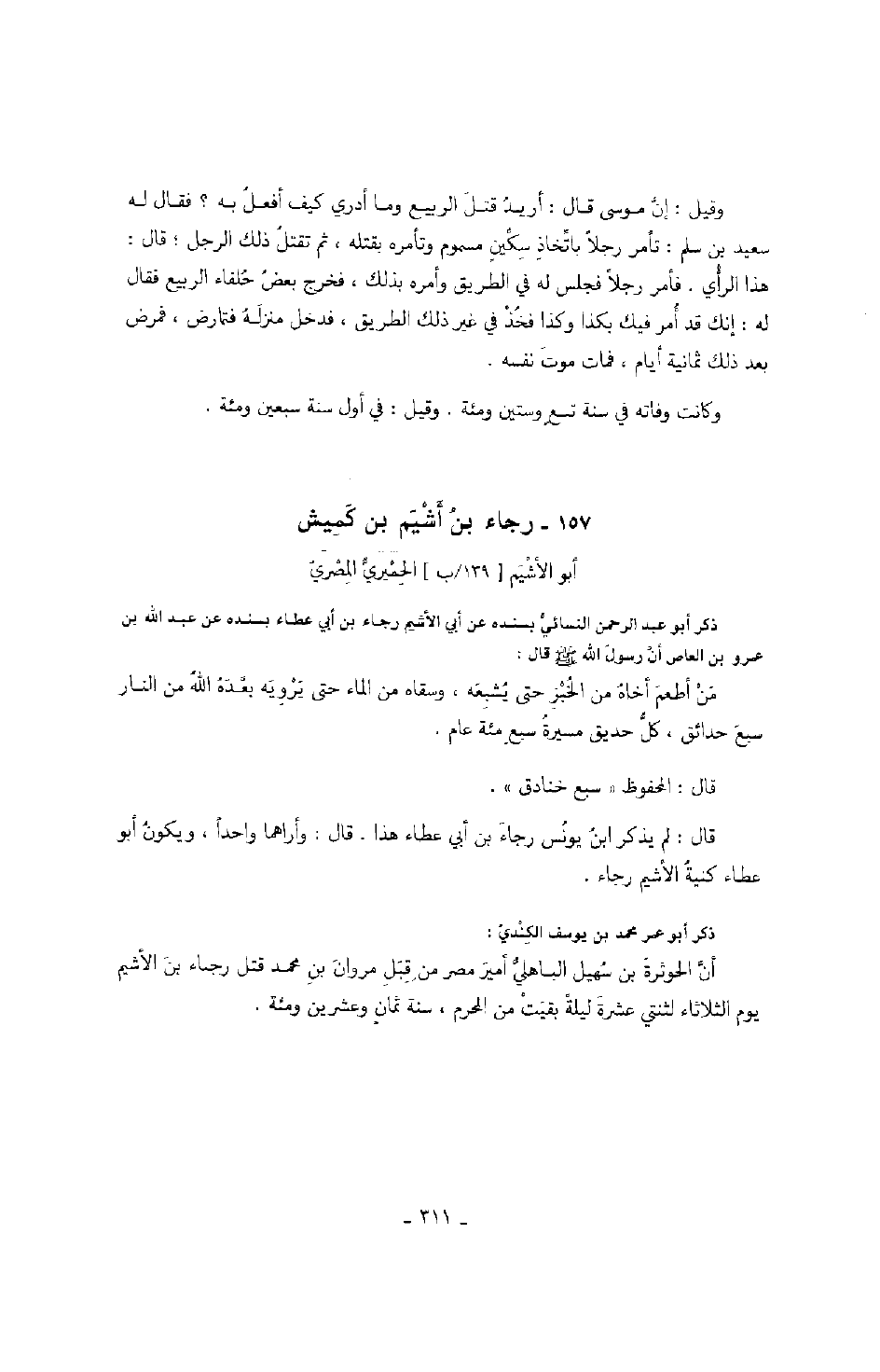 وقيل: إن موسى قال: أريد قتل الربيع وما أدري كيف أفعل به؟ فقال له سعيد بن سلم: تأمر رجلاً باتخاذ سكين مسموم وتأمره بقتله، ثم تقتل ذلك الرجل؛ قال: هذا الرأي. فأمر رجلاً فجلس له في الطريق وأمره بذلك، فخرج بعض حلفاء الربيع فقال له: إنك قد أمر فيك بكذا وكذا فخذ في غير ذلك الطريق، فدخل منزله فتمارض، فمرض بعد ذلك ثمانية أيام، فمات موت نفسه.