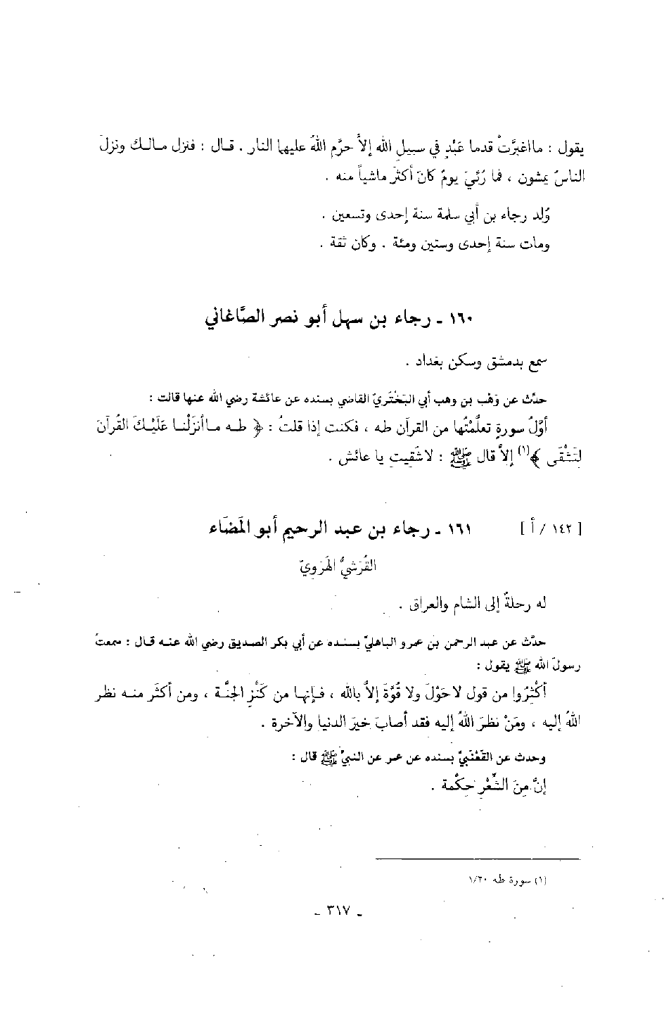 يقول: ما اغبرت قدما عبد في سبيل الله إلا حرم الله عليهما النار. قال: فنزل مالك ونزل الناس يمشون، فما رئي يوم كان أكثر ماشياً منه. ولد رجاء بن ابي سلمة احدى وتسعين ومات سنة احدى وستين ومئة وكان ثقة.