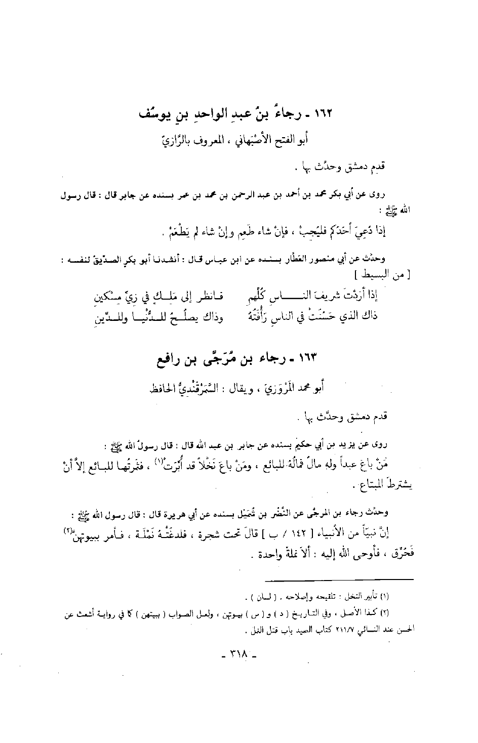 وحدث رجاء بن المرجى عن النضر بن شميل بسنده عن أبي هريرة قال: قال رسول الله صَلَّى اللهُ عَلَيْهِ وَسَلَّمَ: " إن نبياً من الأنبياء قال تحت شجرة، فلدغته نملة، فأمر ببيوتهن فحرق، فأوحى الله إليه: ألا نملة واحدة ".