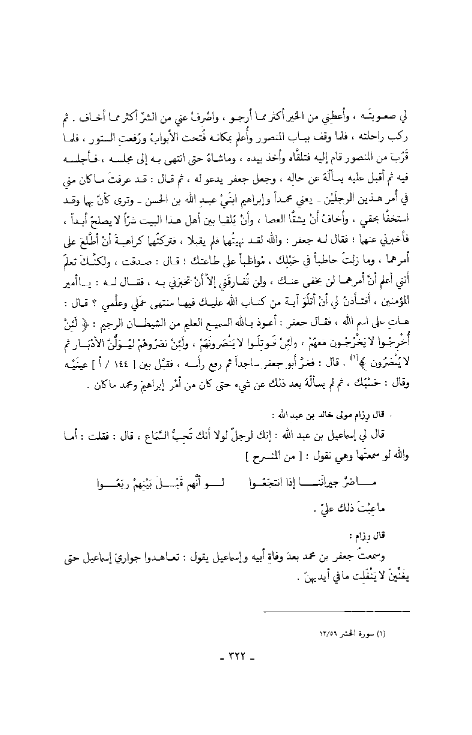 في صعوبته، وأعطني من الخير أكثر مما أرجو، واصرف عني من الشر أكثر مما أخاف. ثم ركب راحلته، فلما وقف بباب المنصور وأعلم بمكانه فتحت الأبواب ورفعت الستور، فلما قرب من المنصور قام إليه فتلقاه وأخذ بيده، وما شاه حتى انتهي به إلى مجلسه، فأجلسه فيه ثم أقبل عليه يسأله عن حاله، وجعل جعفر يدعو له، ثم قال: قد عرفت ما كان مني في أمر هذين الرجلين يعني محمداً وإبراهيم ابني عبد الله بن الحسن وترى كأن بهما وقد استخفا بحقي، وأخاف أن يشقا العصا، وأن يلقيا بين أهل هذا البيت شراً لا يصلح أبداً، فأخبرني عنهما؛ فقال له جعفر: والله لقد نهيتما فلم يقبلا، فتركتهما كراهية أن أطلع على أمرهما، وما زلت حاطباً في حبلك، مواظباً على طاعتك؛ قال: صدقت، ولكنك تعلم أنني أعلم أن أمرهما لن يخفى عنك، ولن تفارقني إلا أن تخبرني به، فقال له: يا أمير المؤمنين، أفتأذن لي أن أتلو آية من كتاب الله عليك فيها منتهى عملي وعلمي؟ قال: هات على اسم الله، فقال جعفر: أعوذ بالله السميع العليم من الشيطان الرجيم: " لئن أخرجوا لا يخرجون معهم، ولئن قوتلوا لا ينصرونهم، ولئن نصروهم ليولن الأدبار ثم لا ينصرون ". قال: فخر أبو جعفر ساجداً ثم رفع رأسه، فقبل بين عينيه وقال: حسبك، ثم لم يسأله بعد ذلك عن شيء حتى كان من أمر إبراهيم ومحمد ما كان.