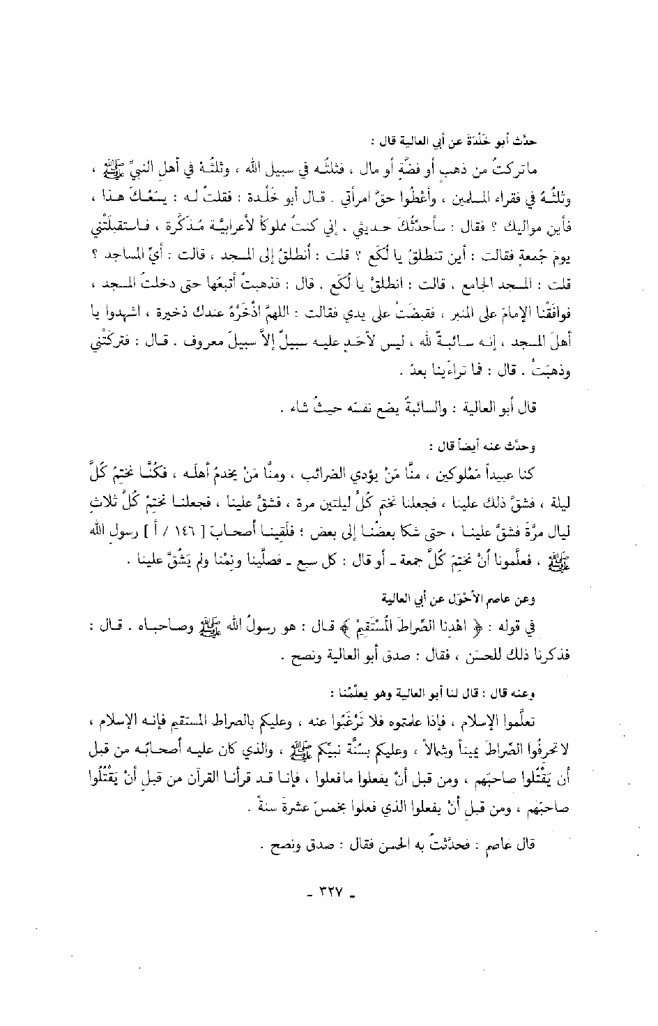 وعنه قال: قال لنا أبو العالية وهو يعلمنا: تعلموا الإسلام، فإذا علمتموه فلا ترغبوا عنه، وعليكم بالصراط المستقيم فإنه الإسلام، لا تحرفوا الصراط يميناً وشمالاً، وعليكم بسنة نبيكم صَلَّى اللهُ عَلَيْهِ وَسَلَّمَ، والذي كان عليه أصحابه من قبل أن يقتلوا صاحبهم، ومن قبل أن يفعلوا ما فعلوا، فإنا قد قرأنا القرآن من قبل أن يقتلوا صاحبهم، ومن قبل أن يفعلوا الذي فعلوا بخمس عشرة سنة.