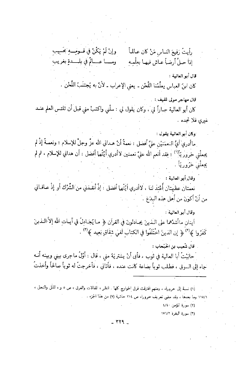 وكان أبو العالية يقول: ما أدري أي النعمتين علي أفضل: نعمة أن هداني الله عز وجل للإسلام؛ ونعمة إذ لم يجعلني حرورياً؛ فقد أنعم الله علي نعمتين لا أدري أيتهما أفضل: أن هداني للإسلام، ثم لم يجعلني حرورياً.