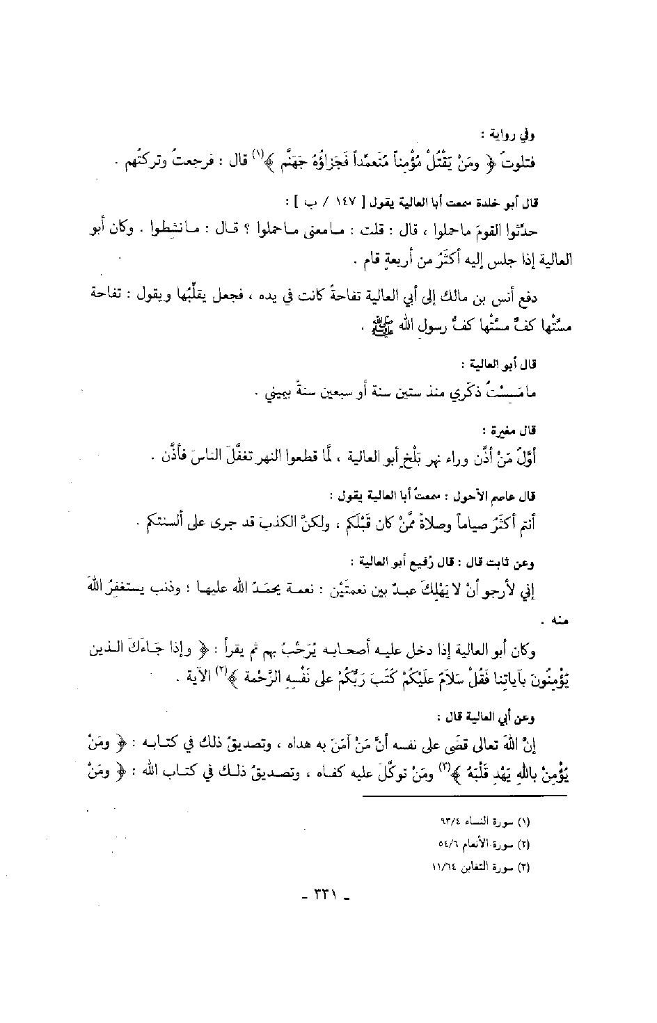 وكان أبو العالية إذا دخل عليه أصحابه يرحب بهم ثم يقرأ: " وإذا جاءك الذين يؤمنون بآياتنا فقل سلام عليكم كتب ربكم على نفسه الرحمة " الآية.