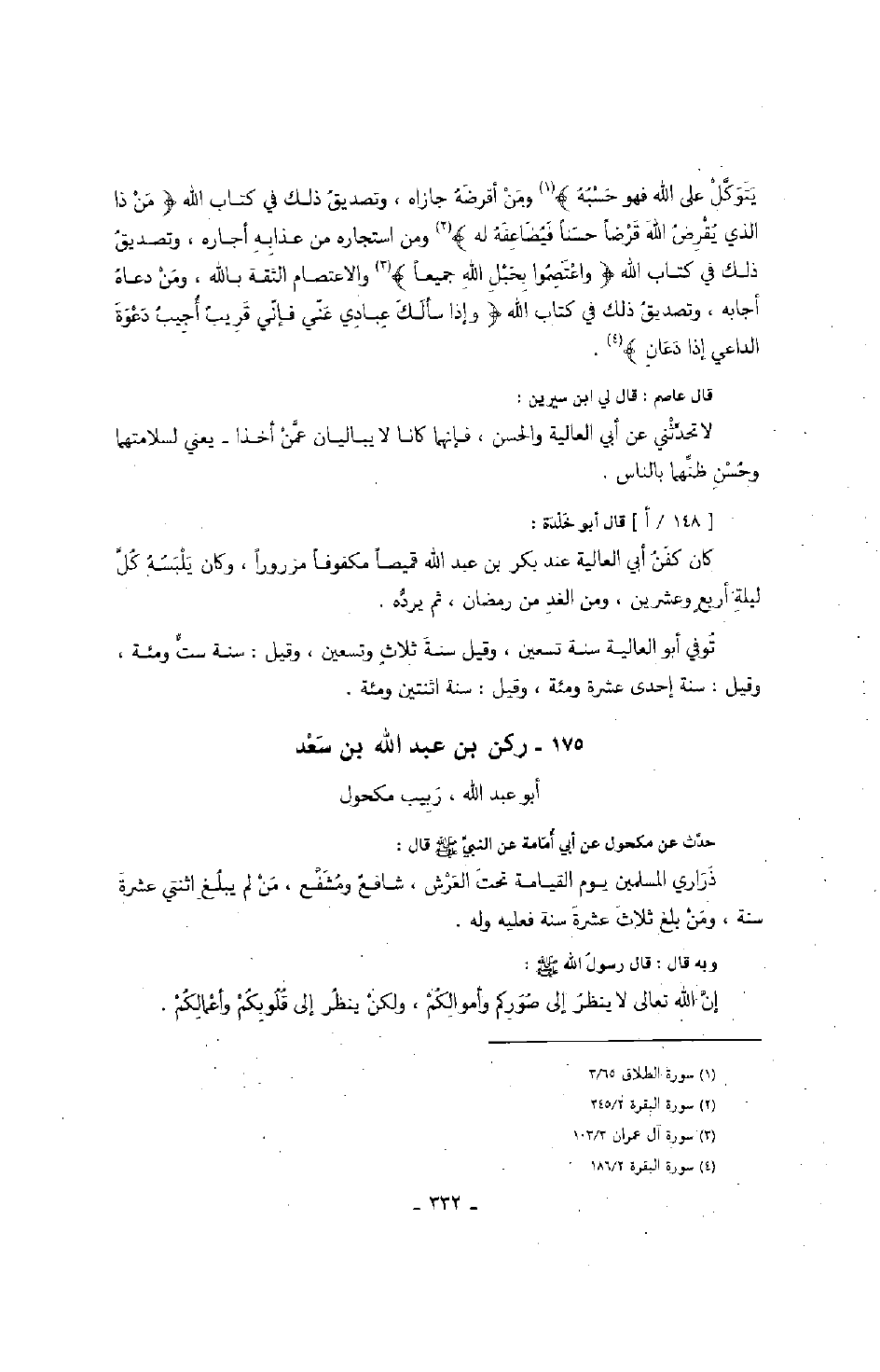 يتوكل على الله فهو حسبه " ومن أقرضه جازاه، وتصديق ذلك في كتاب الله " من ذا الذي يقرض الله قرضاً حسناً فيضاعفه له " ومن استجاره من عذابه أجاره، وتصديق ذلك في كتاب الله " واعتصموا بحبل الله جميعاً " والاعتصام الثقة بالله، ومن دعاه أجابه، وتصديق ذلك في كتاب الله " وإذا سألك عبادي عني فإني قريب أجيب دعوة الداعي إذا دعان ".