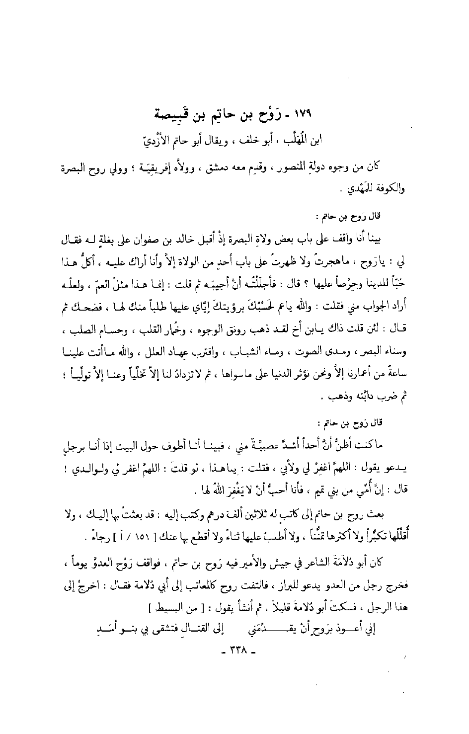 قال روح بن حاتم: ما كنت أظن أن أحداً أشد عصبيةً مني، فبينا أنا أطوف حول البيت إذا أنا برجل يدعو يقول: اللهم اغفر لي ولأبي، فقلت: يا هذا، لو قلت: اللهم اغفر لي ولوالدي! قال: إن أمي من بني تميم، فأنا أحب أن لا يغفر الله لها.