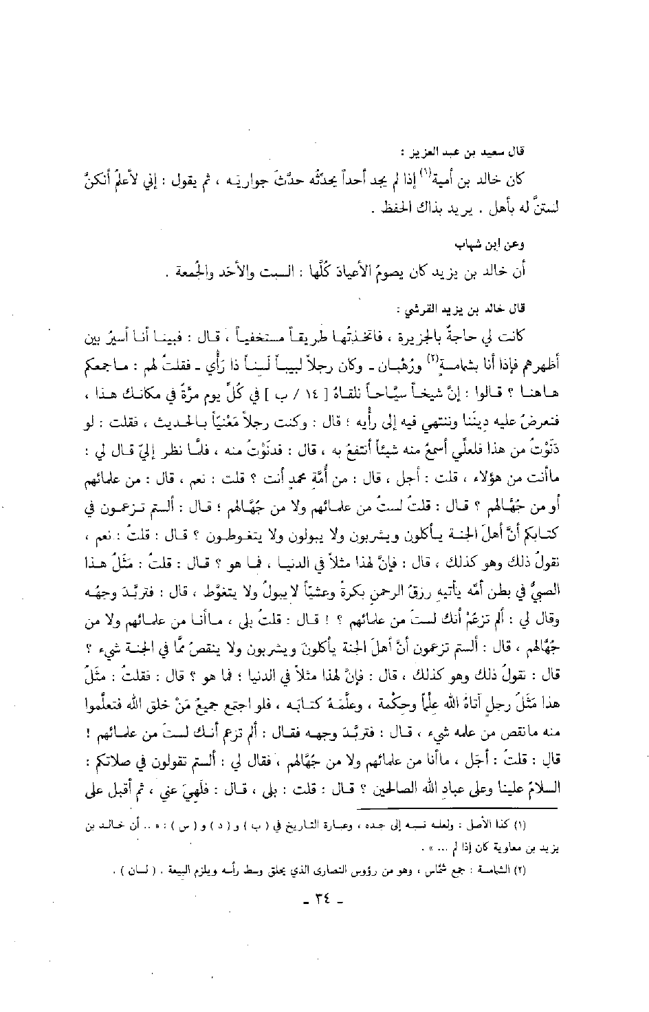 قال خالد بن يزيد القرشي: كانت لي حاجة بالجزيرة، فاتخذتها طريقاً مستخفياً، قال: فبينا أنا أسير بين أظهرهم فإذا أنا بشمامة ورهبان وكان رجلاً لبيباً لسناً ذا رأي فقلت لهم: ما جمعكم هاهنا؟ قالوا: إن شيخاً سياحاً نلقاه في كل يوم مرة في مكانك هذا، فنعرض عليه ديننا وننتهي فيه إلى رأيه؛ قال: وكنت رجلاً معنياً بالحديث، فقلت: لو دنوت من هذا فلعلي أسمع منه شيئاً أنتفع به، منه، فلما نظر إلي قال لي: ما أنت من هؤلاء، قلت: أجل، قال: من أمة محمد أنت؟ قلت: نعم، قال: من علمائهم أو من جهالهم؟ قال: قلت لست من علمائهم ولا من جهالهم؛ قال: ألستم تزعمون في كتابكم أن أهل الجنة يأكلون ويشربون ولا يبولون ولا يتغوطون؟ قال: قلت: نعم، نقول ذلك وهو كذلك، قال: فإن لهذا مثلاُ في الدنيا، فما هو؟ قال: مثل هذا الصبي في بطن أمه يأتيه رزق الرحمن بكرةً وعشياً لا يبول ولا يتغوط، قال: فتربد وجهه وقال لي: ألم تزعم أنك لست من علمائهم؟! قال: قلت بلى، ما أنا من علمائهم ولا من جهالهم، قال: ألستم تزعمون أن أهل الجنة يأكلون ويشربون ولا ينقص مما في الجنة شيء؟ قال: نقول ذلك وهو كذلك، قال: فإن لهذا مثلاً في الدنيا؛ فما هو؟ قال: فقلت: مثل هذا مثل رجل آتاه الله علماً وحكمة، وعلمه كتابه، فلو اجتمع جميع من خلق الله فتعلموا منه ما نقص من علمه شيء، قال: فتربد وجهه فقال: ألم تزعم أنك لست من علمائهم! قال: قلت: أجل، ما أنا من علمائهم ولا من جهالهم، فقال لي: ألستم تقولون في صلاتكم: السلام علينا وعلى عباد الله الصالحين؟ قال: قلت: بلى، قال: فلهي عني، ثم أقبل على