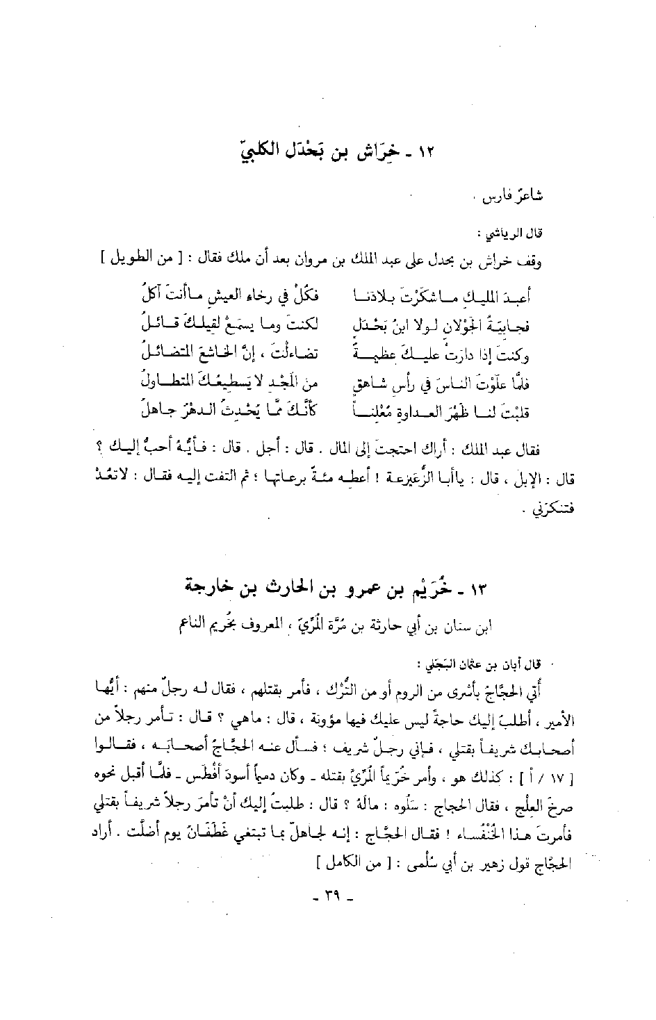 قال الرياشي: وقف خراش بن بحدل على عبد الملك بن مروان بعد أن ملك فقال: