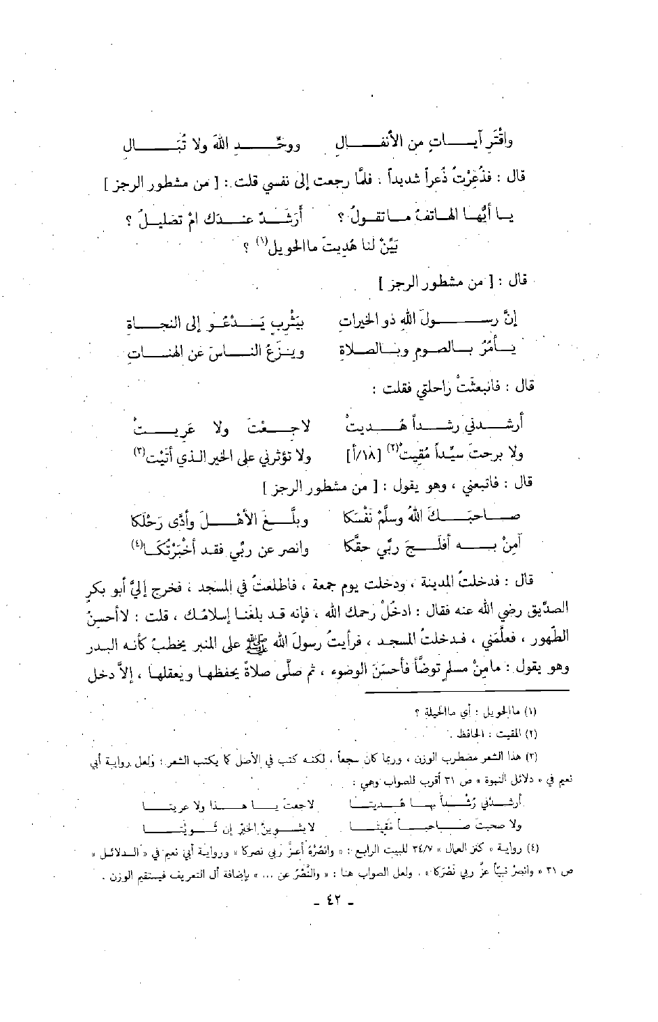 قال: فدخلت المدينة، ودخلت يوم جمعة، فاطلعت في المسجد، فخرج إلي أبو بكر الصديق رضي الله عنه فقال: ادخل رحمك الله، فإنه قد بلغنا من إسلامك، قلت: لا أحسن الطهور، فعلمني، فدخلت المسجد، فرأيت رسول الله صَلَّى اللهُ عَلَيْهِ وَسَلَّمَ على المنبر يخطب كأنه البدر وهو يقول: ما من مسلم توضأ فأحسن الوضوء، ثم صلى صلاة يحفظها ويعقلها، إلا دخل