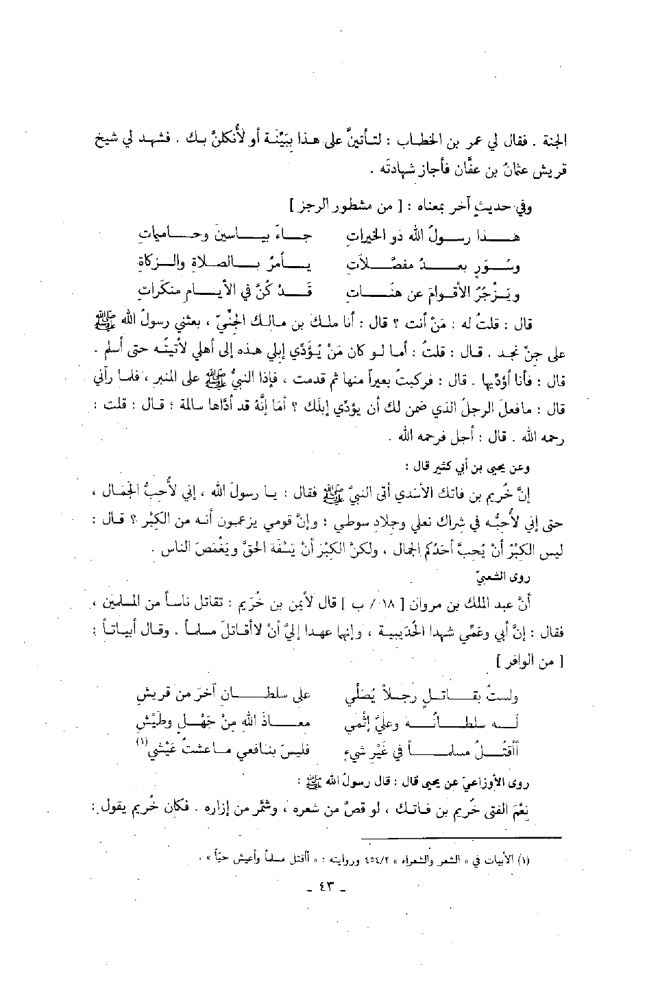 الجنة. فقال لي عمر بن الخطاب: لتأتين على هذا ببينة أو لأنكلن بك. فشهد لي شيخ قريش عثمان بن عفان فأجاز شهادته.