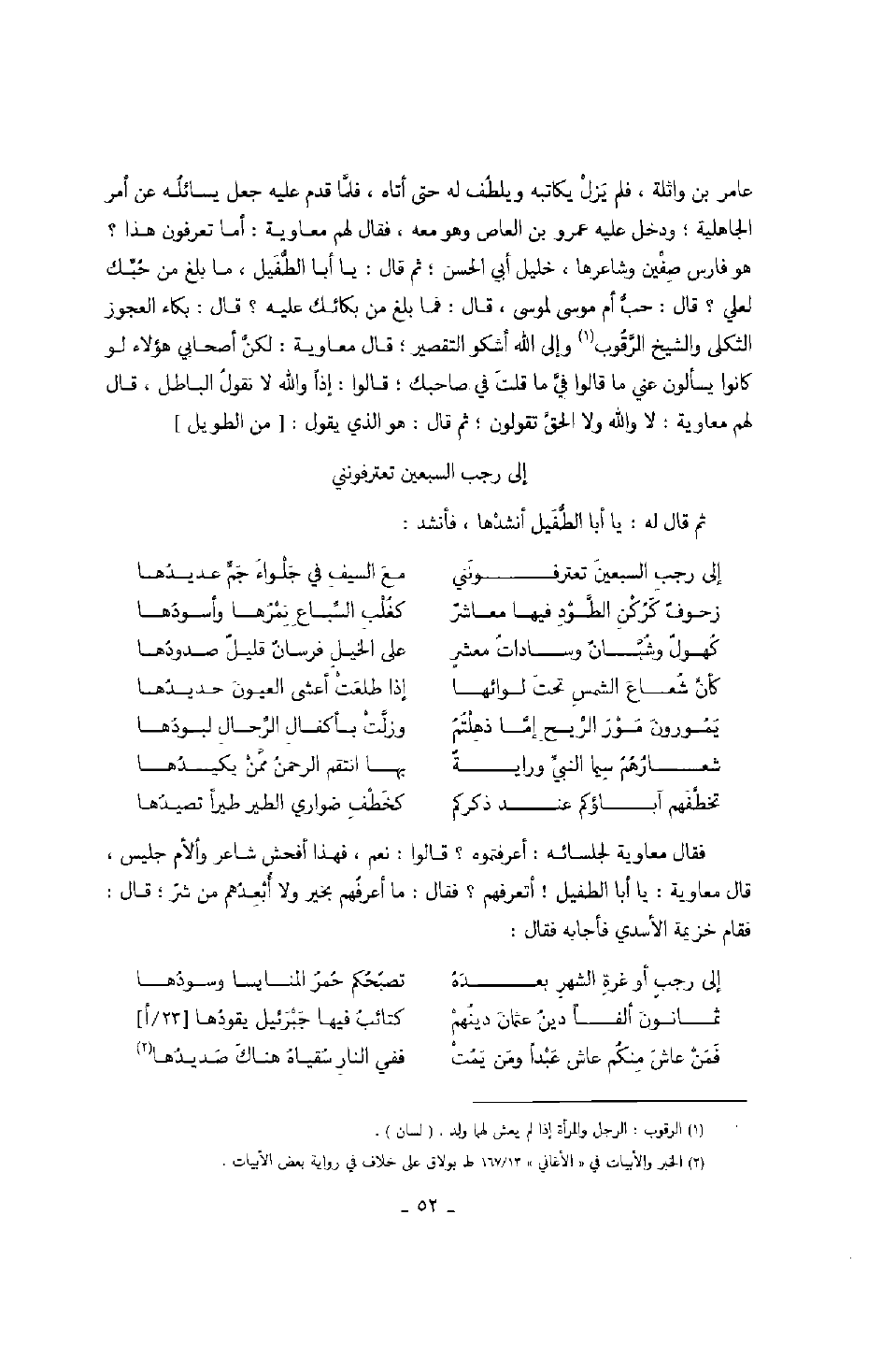 عامر بن واثلة، فلم يزل يكاتبه ويلطف له حتى أتاه، فلما قدم عليه جعل يسائله عن أمر الجاهلية؛ ودخل عليه عمرو بن العاص وهو معه، فقال لهم معاوية: أما تعرفون هذا؟ هو فارس صفين وشاعرها، خليل أبي الحسن؛ ثم قال: يا أبا الطفيل، ما بلغ من حبك لعلي؟ قال: حب أم موسى لموسى، قال: فما بلغ من بكائك عليه؟ قال: بكاء العجوز الثكلى والشيخ الرقوب وإلى الله أشكو التقصير؛ قال معاوية: لكن أصحابي هؤلاء لو كانوا يسألون عني ما قالوا في ما قلت في صاحبك؛ قالوا: إذاً والله لا تقول الباطل، قال لهم معاوية: لا والله ولا الحق تقولون؛ ثم قال: هو الذي يقول: إلى رجب السبعين تعترفونني ثم قال له: يا أبا الطفيل أنشدها، فأنشد: