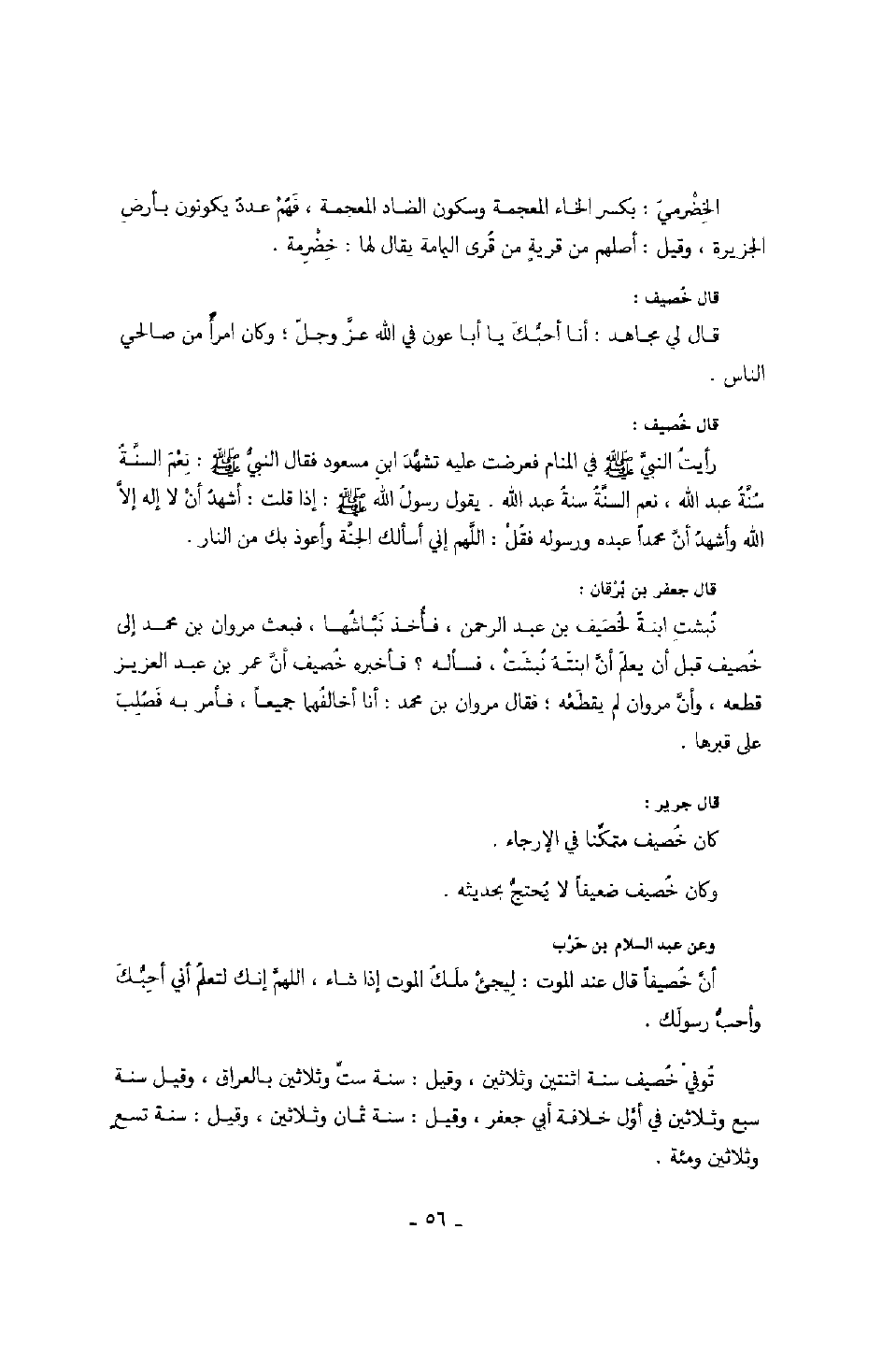 وعن عبد السلام بن حرب: أن خصيفاً قال عند الموت: ليجىء ملك الموت إذا شاء، اللهم إنك لتعلم أني أحبك وأحب رسولك.