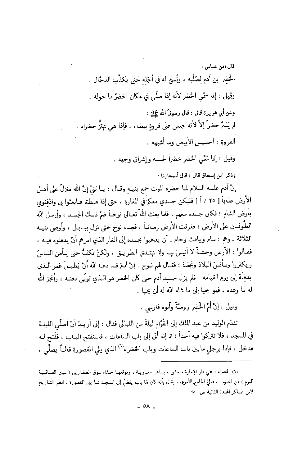 قال ابن عباس: الخضر بن آدم لصلبه، ونسئ له في أجله حتى يكذب الدجال. وقيل: إنما سمي الخضر لأنه إذا صلى في مكان اخضر ما حوله.