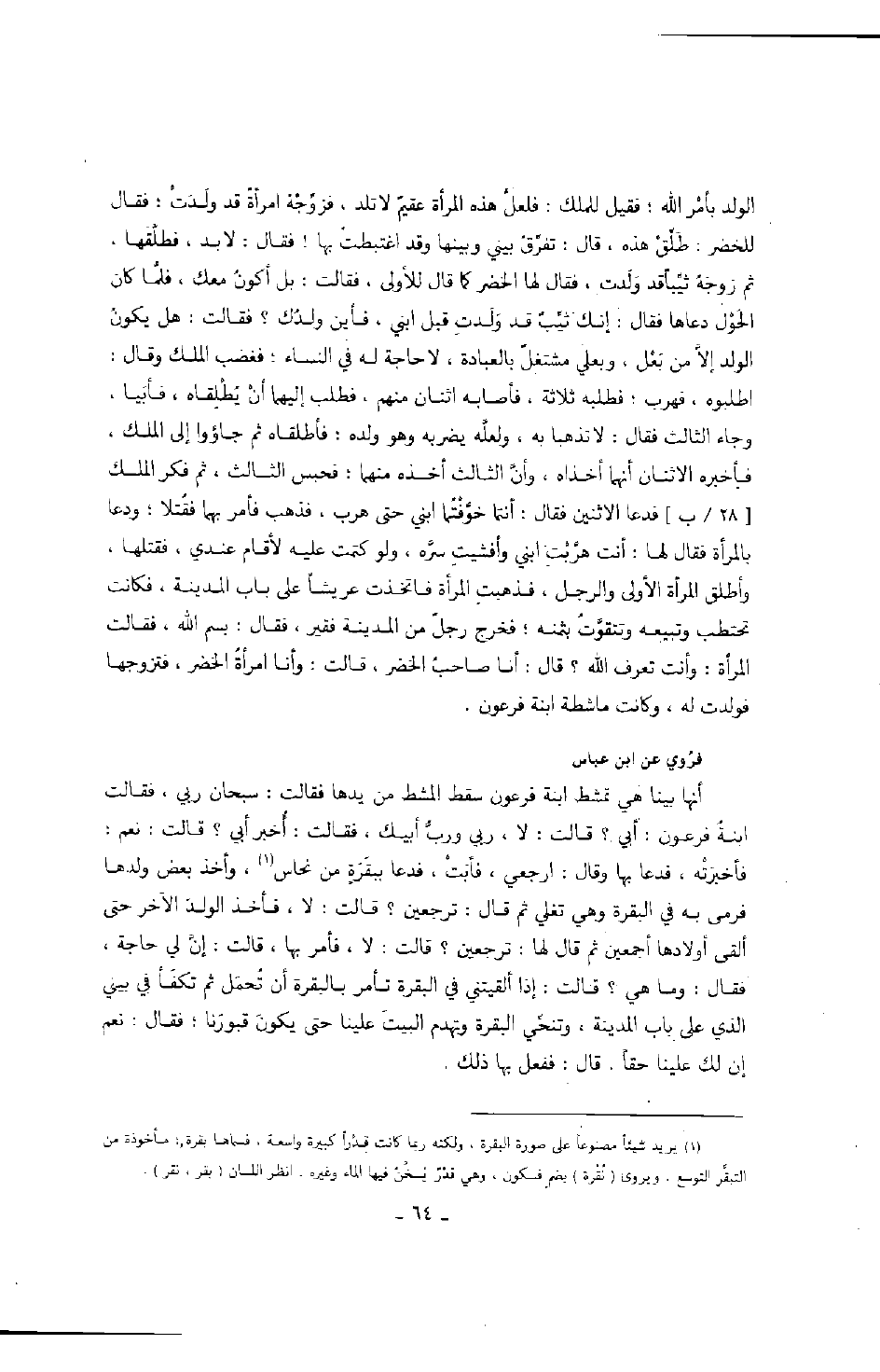 الولد بأمر الله؛ فقيل للملك: فلعل هذه المرأة عقيم لا تلد، فزوجه امرأةً قد ولدت؛ فقال للخضر: طلق هذه، قال: تفرق بيني وبينها وقد اغتبطت بها! فقال: لا بد، فطلقها، ثم زوجه ثيباً قد ولدت، فقال لها الخضر كما قال للأولى، فقالت: بل أكون معك، فلما كان الحول دعاها فقال: إنك ثيب قد ولدت قبل ابني، فأين ولدك؟ فقالت؟ هل يكون الولد إلا من بعل، وبعلي مشتغل بالعبادة، لا حاجة له في النساء؛ فغضب الملك وقال: اطلبوه، فهرب؛ فطلبه ثلاثة، فأصابه اثنان منهم، فطلب إليهما أن يطلقاه، فأبيا، وجاء الثالث فقال: لا تذهبا به، ولعله يضربه وهو ولده؛ فأطلقاه ثم جاؤوا إلى الملك، فأخبره الاثنان أنهما أخذاه، وأن الثالث أخذه منهما؛ فحبس الثالث، ثم فكر الملك فدعا الاثنين فقال: أنتما خوفتما ابني حتى هرب، فذهب فأمر بهما فقتلا؛ ودعا بالمرأة فقال لها: أنت هربت ابني وأفشيت سره، ولو كتمت عليه لأقام عندي، فقتلها، وأطلق المرأة الأولى والرجل، فذهبت المرأة فاتخذت عريشاً على باب المدينة، فكانت تحتطب وتبيعه وتتقوت بثمنه؛ فخرج رجل من المدينة فقير، فقال: بسم الله، فقالت المرأة: وأنت تعرف الله؟ قال: أنا صاحب الخضر، قالت: وأنا امرأة الخضر، فتزوجها فولدت له، وكانت ماشطة ابنة فرعون.