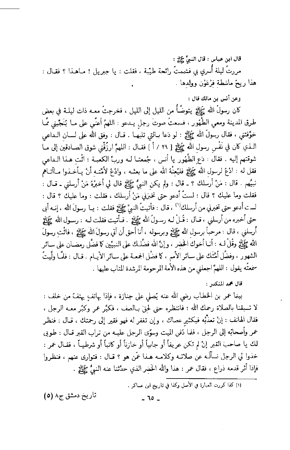 وعن أنس بن مالك قال: كان رسول لله صَلَّى اللهُ عَلَيْهِ وَسَلَّمَ يتوضأ من الليل إلى الليل، فخرجت معه ذات ليلة في بعض طرق المدينة ومعي الطهور، فسمعت صوت رجل يدعو: اللهم أعني على ما ينجيني مما خوفتني، فقال رسول الله صَلَّى اللهُ عَلَيْهِ وَسَلَّمَ: لو دعا بالتي تليها. قال: وفق الله على لسان الداعي الذي كان في نفس رسول الله صَلَّى اللهُ عَلَيْهِ وَسَلَّمَ فقال: اللهم ارزقني شوق الصادقين إلى ما شوقتهم إليه. فقال: دع الطهور يا أنس، جمعتا له ورب الكعبة؛ ائت هذا الداعي فقل له: ادع لرسول الله صَلَّى اللهُ عَلَيْهِ وَسَلَّمَ فليعنه الله على ما بعثه، وادع لأمته أن يأخذوا ما آتاهم نبيهم. قال: من أرسلك؟ قال: ولم يكن النبي صَلَّى اللهُ عَلَيْهِ وَسَلَّمَ قال لي أخبره من أرسلني قال: فقلت وما عليك؟ قال: لست أدعو حتى تخبرني من أرسلك، فقلت: وما عليك؟ قال: لست أدعو حتى تخبرني من أرسلك، قال: فأتيت النبي صَلَّى اللهُ عَلَيْهِ وَسَلَّمَ فقلت: يا رسول الله، إنه أبى حتى أخبره من أرسلني، قال: قل له رسول الله صَلَّى اللهُ عَلَيْهِ وَسَلَّمَ. فأتيت فقلت له: رسول الله صَلَّى اللهُ عَلَيْهِ وَسَلَّمَ أرسلني، قال: مرحباً برسول الله صَلَّى اللهُ عَلَيْهِ وَسَلَّمَ وبرسوله، أنا أحق أن آتي رسول الله صَلَّى اللهُ عَلَيْهِ وَسَلَّمَ، فائت رسول الله صَلَّى اللهُ عَلَيْهِ وَسَلَّمَ وقل له: أنا أخوك الخضر، وإن الله فضلك على النبيين كما فضل رمضان على سائر الشهور، وفضل أمتك على سائر الأمم، كما فضل الجمعة على سائر الأيام. قال: فلما وليت سمعته يقول: اللهم اجعلني من هذه الأمة المرحومة المرشدة المتاب عليها.