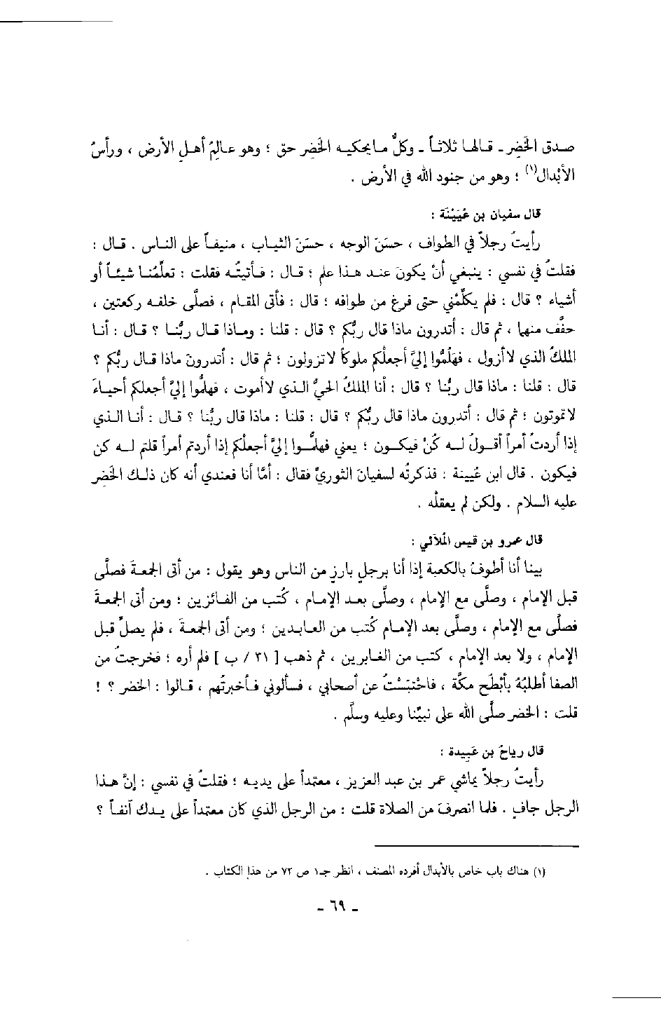 قال سفيان بن عيينة: رأيت رجل في الطواف، حسن الوجه، حسن الثياب، منيفاً على الناس. قال: فقلت في نفسي: ينبغي أن يكون عند هذا علم؛ قال: فأتيته فقلت: تعلمنا شيئاً أو أشياء؟ قال: فلم يكلمني حتى فرغ من طوافه؛ قال: فأتى المقام، فصلى خلفه ركعتين، حفف منهما، ثم قال: أتدرون ماذا قال ربكم؟ قال: قلنا: وماذا قال ربنا؟ قال: أنا الملك الذي لا أزول، فهلموا إلي أجعلكم ملوكاً لا تزولون؛ ثم قال: أتدرون ماذا قال ربكم؟ قال: قلنا: ماذا قال ربنا؟ قال: أنا الملك الحي الذي لا أموت، فهلموا إلي أجعلكم أحياء لا تموتون؛ ثم قال: أتدرون ماذا قال ربكم؟ قال: قلنا: ماذا قال ربنا؟ قال: أنا الذي إذا أردت أمراً أقول له كن فيكون؛ يعني فهلموا إلي أجعلكم إذا أردتم أمراً قلتم له كن فيكون. قال ابن عيينة: فذكرته لسفيان الثوري فقال: أما أنا فعندي أنه كان ذلك الخضر عليه السلام. ولكن لم يعقله.