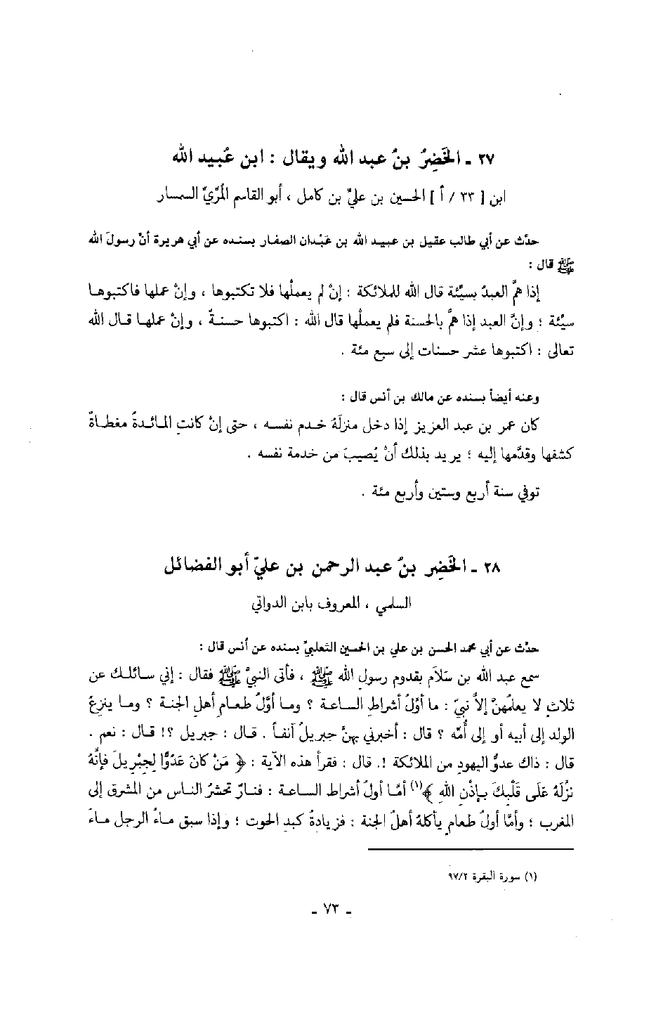 أبو الفضائل السلمي، المعروف بابن الدواتي حدث عن أبي محمد الحسن بن علي بن الحسين الثعلبي بسنده عن أنس قال: سمع عبد الله بن سلام بقدوم رسول الله صَلَّى اللهُ عَلَيْهِ وَسَلَّمَ، فأتى النبي صَلَّى اللهُ عَلَيْهِ وَسَلَّمَ فقال: إني سائلك عن ثلاث لا يعلمهن إلا نبي: ما أول أشراط الساعة؟ وما أول طعام أهل الجنة؟ وما ينزع الولد إلى أبيه أو إلى أمه؟ قال: أخبرني بهن جبريل آنفاً. قال: جبريل؟! قال: نعم. قال: ذاك عدو اليهود من الملائكة!. قال: فقرأ هذه الآية: " من كان عدواً لجبريل فإنه نزله على قلبك بإذن الله " أما أول أشراط الساعة: فنار تحشر الناس من المشرق إلى المغرب؛ وأما أول طعام أهل الجنة: فزيادة كبد الحوت؛ وإذا سبق ماء الرجل ماء