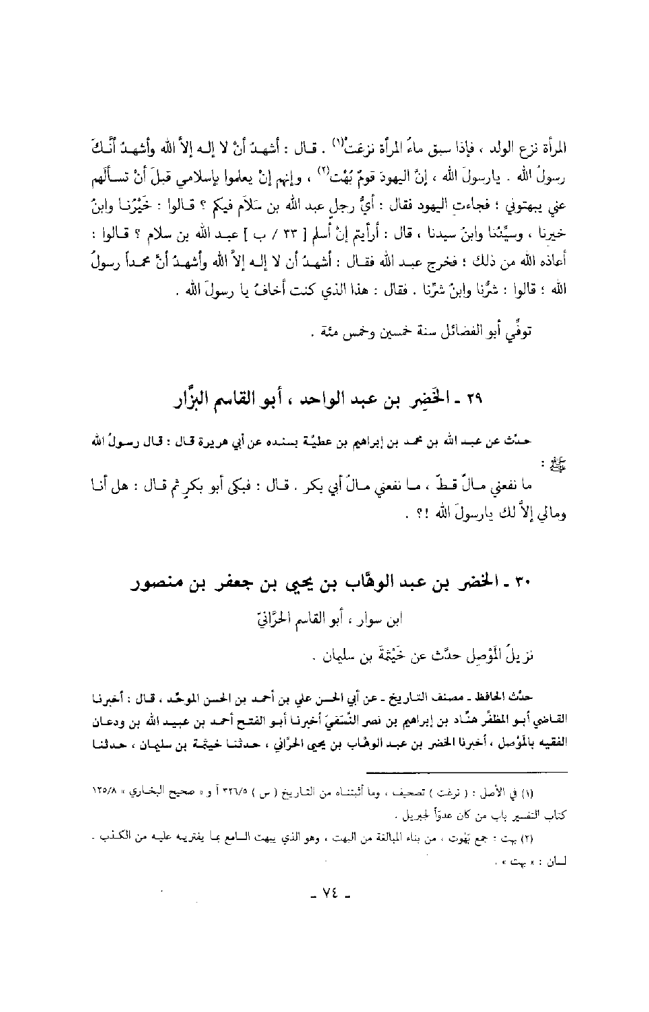 حدث الحافظ مصنف التاريخ عن أبي الحسن علي بن أحمد بن الحسن الموحد، قال: أخبرنا القاضي أبو المظفر هناد بن إبراهيم بن نصر النسفي أخبرنا أبو الفتح أحمد بن عبيد الله بن ودعان الفقيه بالموصل، أخبرنا الخضر بن عبد الوهاب بن يحيى الحراني، حدثنا خيثمة بن سليمان، حدثنا