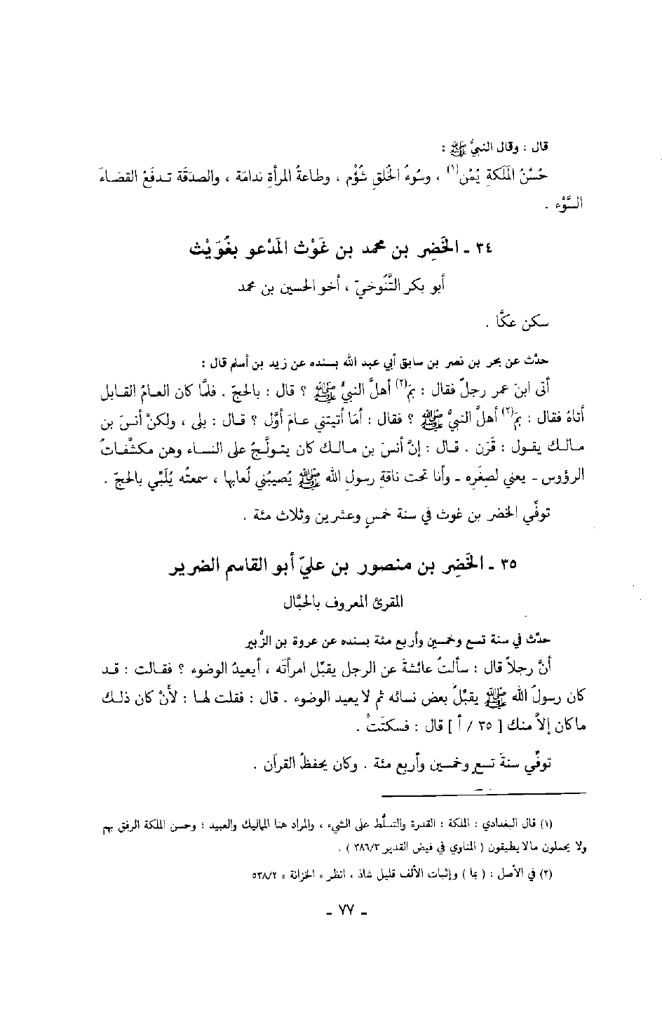حدث عن بحر بن نصر بن سابق أبي عبد الله بسنده عن زيد بن أسلم قال: أتى ابن عمر رجل فقال: بم أهل النبي صَلَّى اللهُ عَلَيْهِ وَسَلَّمَ؟ قال: بالحج. فلما كان العام القابل أتاه فقال: بم أهل النبي صَلَّى اللهُ عَلَيْهِ وَسَلَّمَ؟ فقال: أما أتيتني عام أول؟ قال: بلى، ولكن أنس بن مالك يقول: قرن. قال: إن أنس بن مالك كان يتولج على النساء وهن مكشفات الرؤوس يعني لصغره وأنا تحت ناقة رسول الله صَلَّى اللهُ عَلَيْهِ وَسَلَّمَ يصيبني لعابها، سمعته يلبي بالحج.