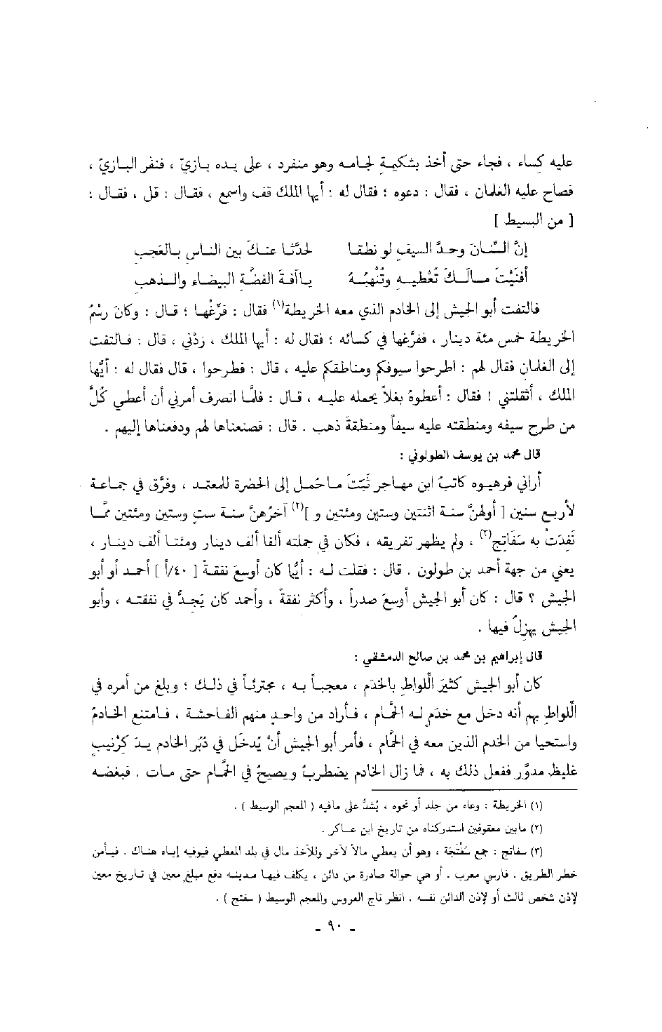 فالتفت أبو الجيش إلى الخادم الذي معه الخريطة فقال: فرغها؛ قال: وكان رسم الخريطة خمس مئة دينار، ففرغها في كسائه؛ فقال له: أيها الملك، زدني، قال: فالتفت إلى الغلمان فقال لهم: اطرحوا سيوفكم ومناطقكم عليه، قال: فطرحوا، قال فقال له: أيها الملك، أثقلتني! فقال: أعطوه بغلاُ يحمله عليه، قال: فلما انصرف أمرني أن أعطي كل من طرح سيفه ومنطقته عليه سيفاً ومنطقة ذهب. قال: فصنعناها لهم ودفعناها إليهم.