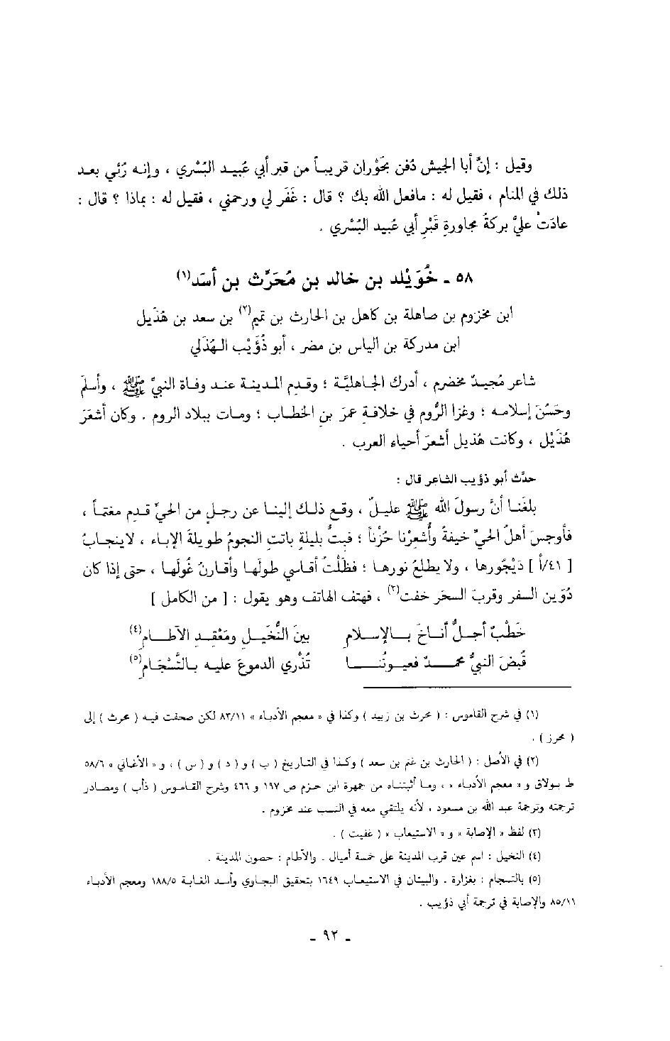 حدث أبو ذؤيب الشاعر قال: بلغنا أن رسول الله صَلَّى اللهُ عَلَيْهِ وَسَلَّمَ عليل، وقع ذلك إلينا عن رجل من الحي قدم مغتماً، فأوجس أهل الحي خيفةً وأشعرنا حزناً؛ فبت بليلة باتت النجوم طويلة الإباء، لا ينجاب ديجورها، ولا يطلع نورها؛ فظلت أقاسي طولها وأقارن غولها، حتى إذا كان دوين السفر وقرب السحر خفت، فهتف الهاتف وهو يقول: