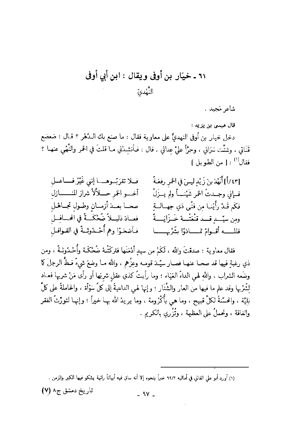 قال عيسى بن يزيد: دخل خيار بن أوفى النهدي على معاوية فقال: ما صنع بك الدهر؟ قال: ضعضع قناتي، وشتت سراتي، وجرأ علي عداتي. قال: فأنشدني ما قلت في الخمر والنهي عنها؟ فقال: