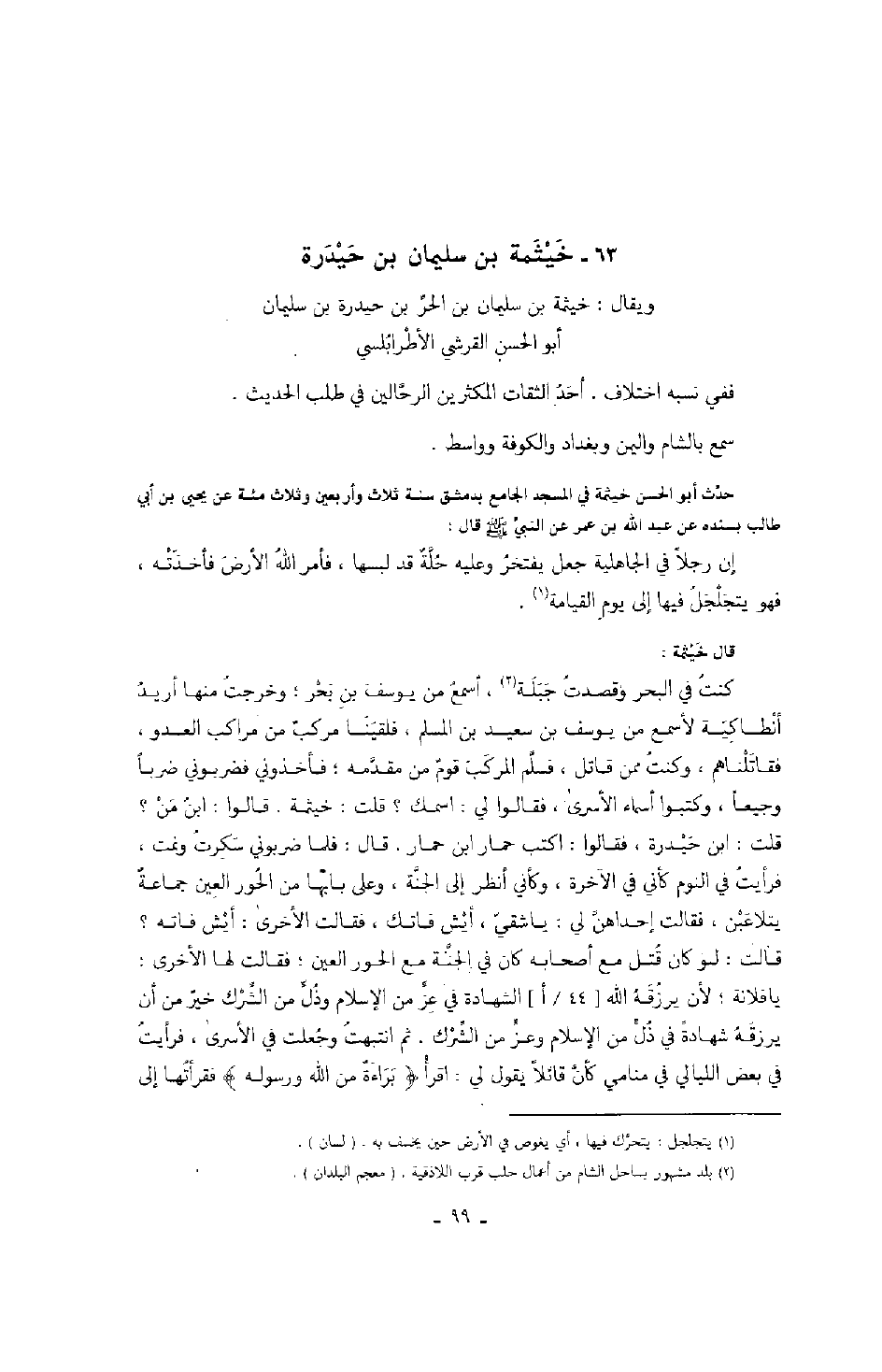 حدث أبو الحسن خيثمة في المسجد الجامع بدمشق سنة ثلاث وأربعين وثلاث مئة عن يحيى بن أبي طالب بسنده عن عبد الله بن عمر عن النبي صَلَّى اللهُ عَلَيْهِ وَسَلَّمَ قال: " إن رجلاً في الجاهلية جعل يفتخر وعليه حلة قد لبسها، فأمر الله الأرض فأخذته، فهو يتجلجل فيها إلى يوم القيامة ".