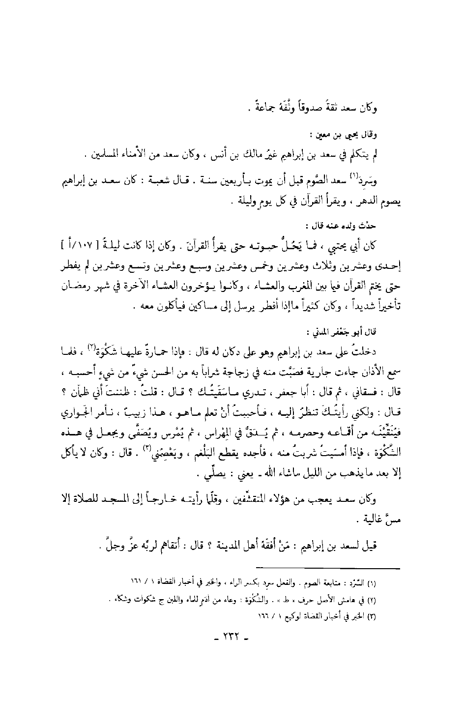 دخلت على سعد بن إبراهيم وهو على دكانه له قال: فإذا حمارةً عليها شكوة، فلما سمع الأذان جاءت جارية فصبت منه في زجاجة شراباً به من الحسن شيءٌ من شيءٍ أحسبه، قال: فسقاني، ثم قال: أبا جعفر، تدري ما سقيتك؟ قال: قلت: ظننت إني ظمآن؟ قال: ولكني رأيتك تنظر إليه، فأحببت أن تعلم ما هو، هذا زبيبٌ، نأمر الجواري فينقينه من أقماعه وحصرمه، ثم يدق في المهراس، ثم يمرس ويصفى ويجعل في هذه الشكوة، فإذا أمسيت شربت منه، فأجده يقطع البلغم، ويعصمني، قال: وكان لا يأكل إلا بعد ما يذهب من الليل ما شاء الله يعني: يصلي.