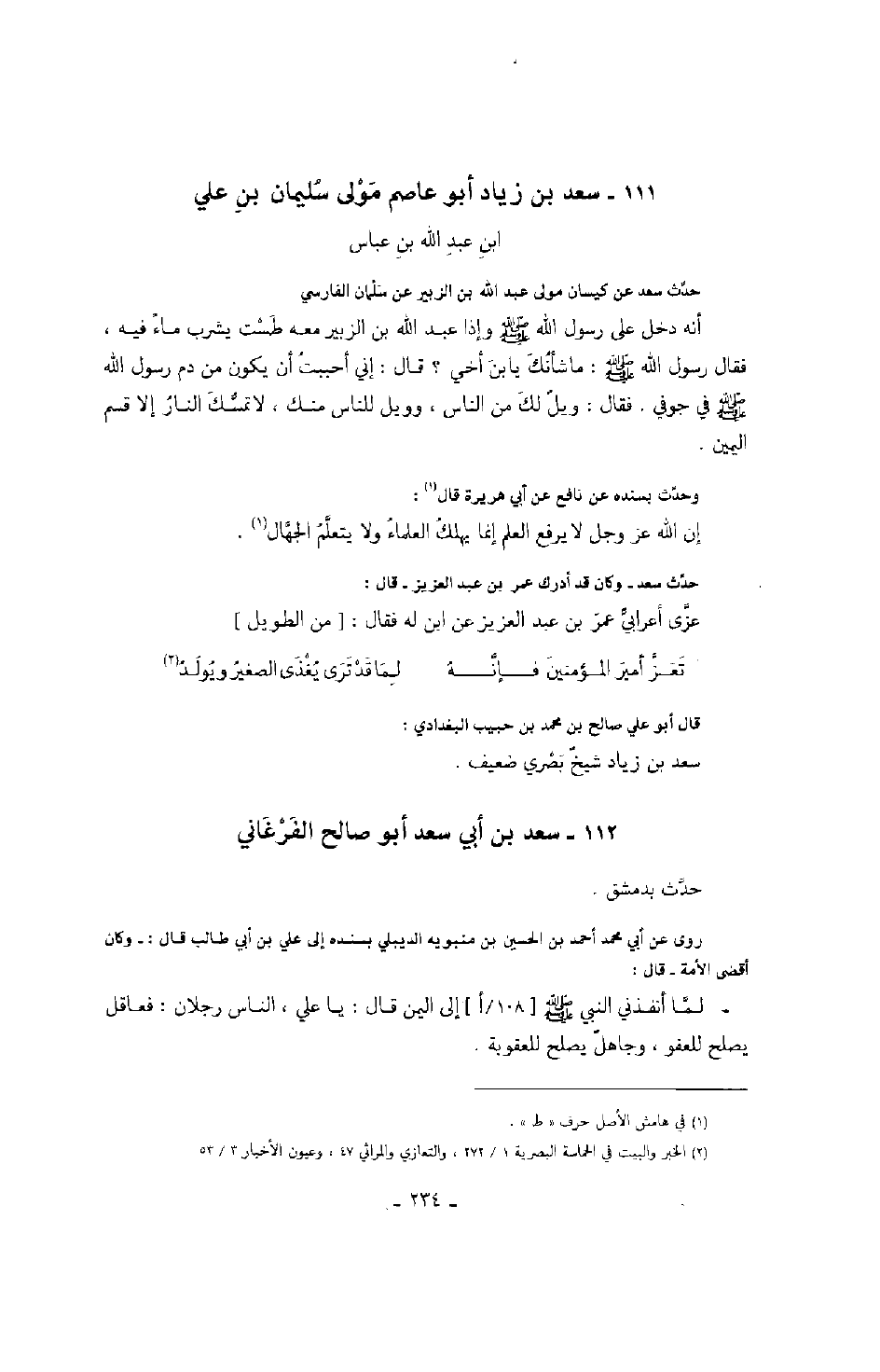 وحدث بسنده عن نافع عن أبي هريرة قال: " إن الله عز وجل لا يرفع العلم إنما يهلك العلماء ولا يتعلم الجهال " حدث سعد وكان قد أدرك عمر بن عبد العزيز قال: عزى أعرابيٌّ بن عبد العزيز عن ابن له فقال: من الطويل