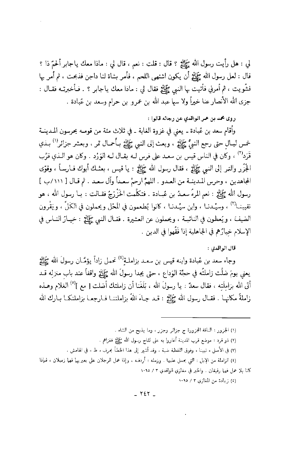 قال الواقدي: وجاء سعد بن عبادة وابنه قيس بن سعد بزاملةٍ تحمل زاداً يؤمان رسول الله صَلَّى اللهُ عَلَيْهِ وَسَلَّمَ يعني يوم ضلت زاملته في حجة الوداع، حتى يجدا رسول الله صَلَّى اللهُ عَلَيْهِ وَسَلَّمَ واقفاً عند باب منزله قد أتى الله بزاملته. فقال سعد: يا رسول الله، بلغنا أن زاملتك أضلت مع الغلام وهذه زاملةٌ مكانها. فقال رسول الله صَلَّى اللهُ عَلَيْهِ وَسَلَّمَ: قد جاء الله بزاملتنا فارجعا بزاملتكما بارك الله