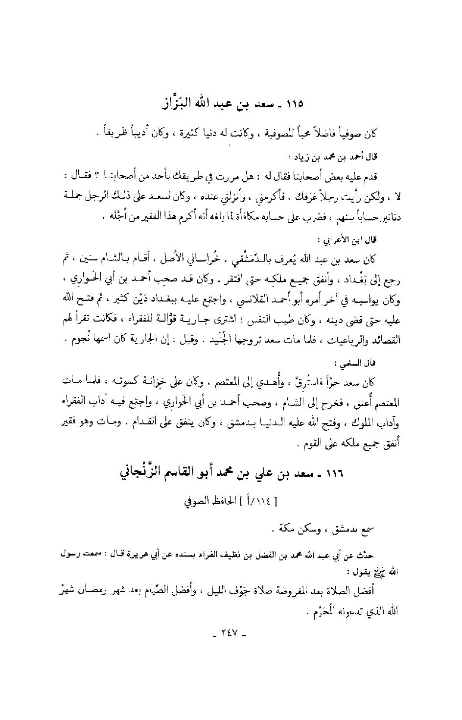 قال ابن الأعرابي: كان سعد بن عبد الله يعرف بالدمشقي، خراساني الأصل، أقام بالشام سنين، ثم رجع إلى بغداد، وأنفق جميع ملكه حتى افتقر. وكان قد صحب أحمد بن أبي الحواري، وكان يواسيه في آخر أمره أبو أحمد القلانسي، واجتمع عليه ببغداد دين كثير، ثم فتح الله عليه حتى قضى دينه، وكان طيب النفس، اشترى جارية قوالة للفقراء، فكانت تقرأ لهم القصائد والرباعيات، فلما مات سعد تزوجها الجنيد. وقيل: إن الجارية كان اسمها نجوم.