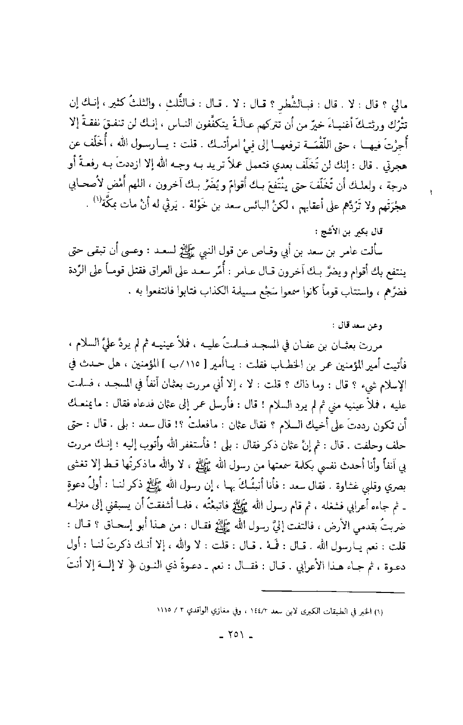 وعن سعد قال: مررت بعثمان بن عفان في المسجد فسلمت عليه، فملأ عينيه ثم لم يرد علي السلام، فأتيت أمير المؤمنين عمر بن الخطاب فقلت: يا أمير المؤمنين، هل حدث في الإسلام شيء؟ قال: وما ذاك؟ قلت: لا، إلا أني مررت بعثمان آنفاً في المسجد، فسلمت عليه، فملأ عينيه مني ثم لم يرد السلام! قال: فأرسل عمر إلى عثمان فدعاه فقال: ما يمنعك أن تكون رددت على أخيك السلام؟ فقال عثمان: ما فعلت؟ قال سعد: بلى. قال: حتى حلف وحلفت. قال: ثم إن عثمان ذكر فقال: بلى! فأستغفر الله وأتوب إليه، إنك مررت بي آنفاً وأنا أحدث نفسي بكلمة من رسول الله صَلَّى اللهُ عَلَيْهِ وَسَلَّمَ، لا والله ما ذكرتها قط إلا تغشى بصري وقلبي غشاوة. فقال سعد: فأنا أنبئك بها، إن رسول الله صَلَّى اللهُ عَلَيْهِ وَسَلَّمَ ذكر لنا: أول دعوةٍ ثم جاءه أعرابي فشغله، ثم قام رسول الله صَلَّى اللهُ عَلَيْهِ وَسَلَّمَ فاتبعته، فلما أشفقت أن يسبقني إلى منزله ضربت بقدمي الأرض، فالتفت إلي رسول الله صَلَّى اللهُ عَلَيْهِ وَسَلَّمَ فقال: من هذا أبو إسحاق.؟ قال: قلت: نعم يا رسول الله. قال: فمه. قال: قلت: لا والله، إلا أنك ذكرت لنا: أول دعوة، ثم جاء هذا الأعرابي. قال: فقال: نعم دعوة ذي النون " لا إله إلا أنت