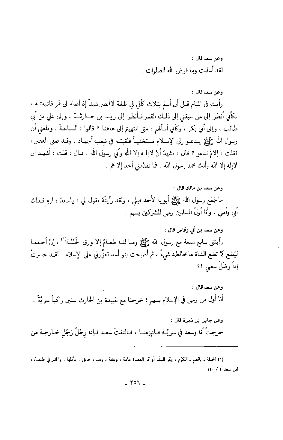 وعن سعد بن مالك قال: ما جمع رسول الله صَلَّى اللهُ عَلَيْهِ وَسَلَّمَ أبويه لأحد قبلي، ولقد رأيته يقول لي: " يا سعد، ارم فداك أبي وأمي، وأنا أول المسلمين رمى المشركين بسهم. " وعن سعد بن أبي وقاص قال: رأيتني سابع سبعة مع رسول الله صَلَّى اللهُ عَلَيْهِ وَسَلَّمَ وما لنا طعامٌ إلا ورق الحبلة، إن أحدنا ليضع كما تضع الشاة ما يخالطه شيءٌ، ثم أصبحت بنو أسد تعزرني على الإسلام. لقد خسرت إذاً وضل سعيي!؟ وعن سعد قال: أنا أول من رمى في الإسلام بسهمٍ، خرجنا مع عبيدة بن الحارث ستين راكباً سرية.