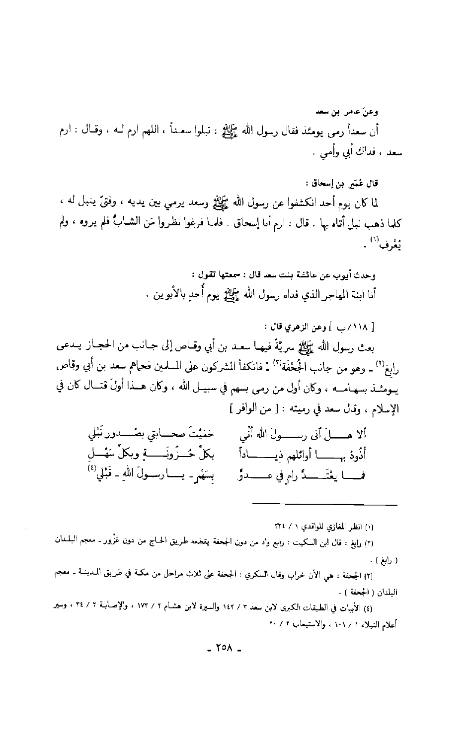 وعن الزهري قال: بعث رسول الله صَلَّى اللهُ عَلَيْهِ وَسَلَّمَ سريةً فيها سعد بن أبي وقاص إلى جانب من الحجاز يدعى رابغ وهو من جانب الجحفة فانكفأ المشركون على المسلمين فحماهم سعد بن أبي وقاص يومئذ بسهامه، وكان أول من رمى بسهم في سبيل الله، وكان هذا أول قتال كان في الإسلام، وقال سعد في رميته: من الوافر
