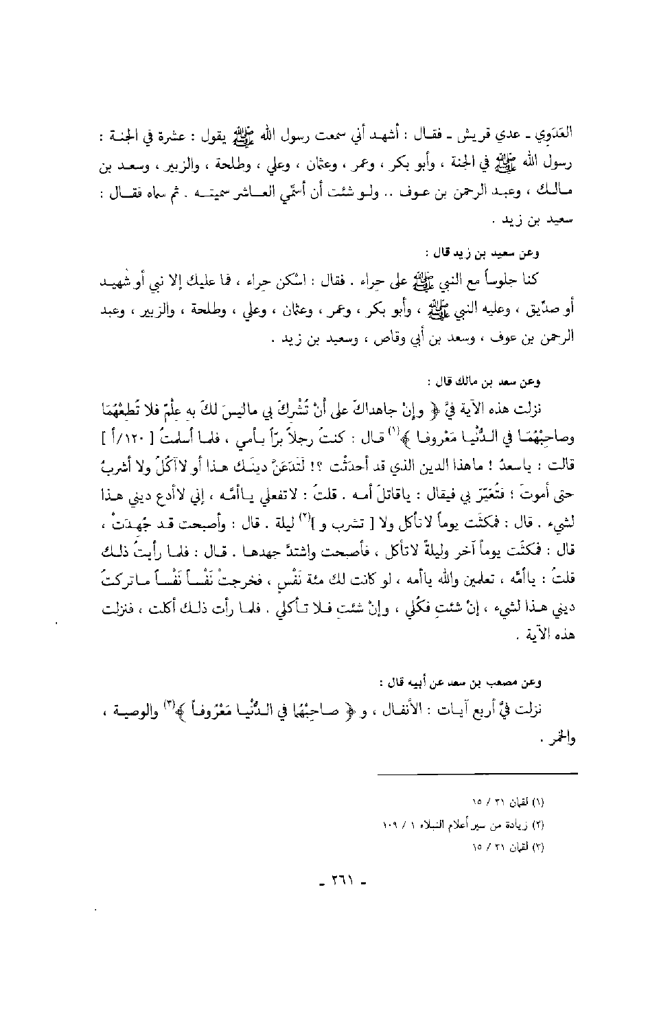 وعن سعيد بن زيد قال: كنا جلوساً مع النبي صَلَّى اللهُ عَلَيْهِ وَسَلَّمَ على حراء. فقال: اسكن حراء، فما عليك إلا نبي أو شهيد أو صديق، وعليه النبي صَلَّى اللهُ عَلَيْهِ وَسَلَّمَ، وأبو بكر، وعمر، وعثمان، وعلي، وطلحة، والزبير، وعبد الرحمن بن عوف، وسعد بن أبي وقاص، وسعيد بن زيد. " وعن سعد بن مالك قال: نزلت هذه الآية في: " وإن جاهداك على أن تشرك بي ما ليس لك به علمٌ فلا تطعهما وصاحبهما في الدنيا معروفا ". قال: كنت رجلاً براً بأمي، فلما أسلمت قالت: يا سعد! ما هذا الدين الذي قد أحدثت!؟ لتدعن دينك هذا أو ولا آكل ولا أشرب حتى أموت، فتعير بي فيقال: يا قاتل أمه. قلت: لا تفعلي يا أمه، إني لا أدع ديني هذا لشيء. قال: فمكثت يوماً لا تأكل ولا تشرب وليلة. قال: وأصبحت قد جهدت، قال: فمكثت يوماً آخر وليلةً لا تأكل، فأصبحت واشتد جهدها. قال: فلما رأيت ذلك قلت: يا أمهن تعلمين والله يا أمه، لو كانت لك مئة نفسٍ، فخرجت نفساً نفساً ما تركت ديني هذا لشيء، إن شئت فكلي، وإن شئت فلا تأكلي، فلما رأت ذلك أكلت، فنزلت هذه الآية.