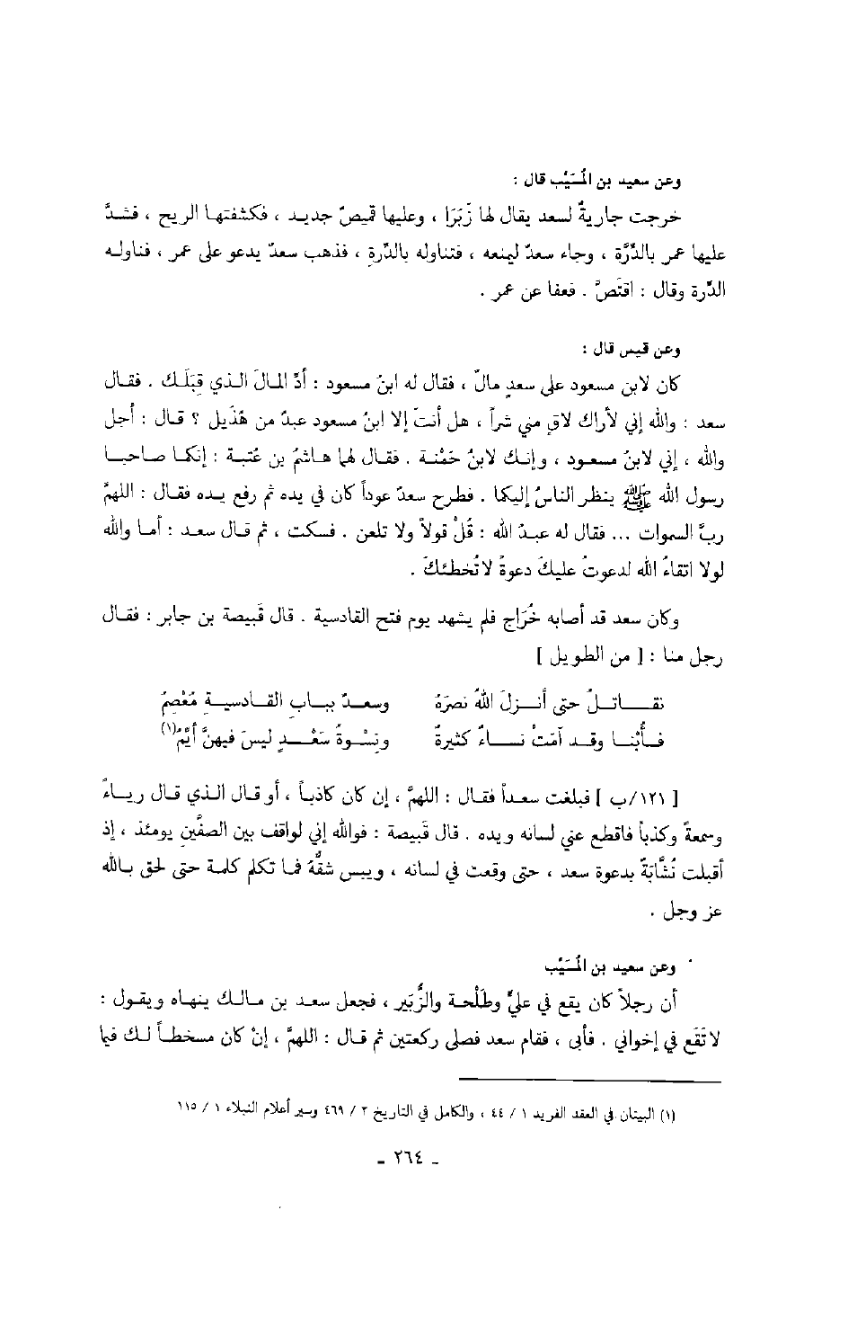 وعن سعيد بن المسيب: أن رجلاً كان يقع في علي وطلحة والزبير، فجعل سعد بن مالك ينهاه ويقول: لا تقع في إخواني، فأبى، فقام سعد فصلى ركعتين ثم قال: اللهم، إن كان مسخطاً لك فيما